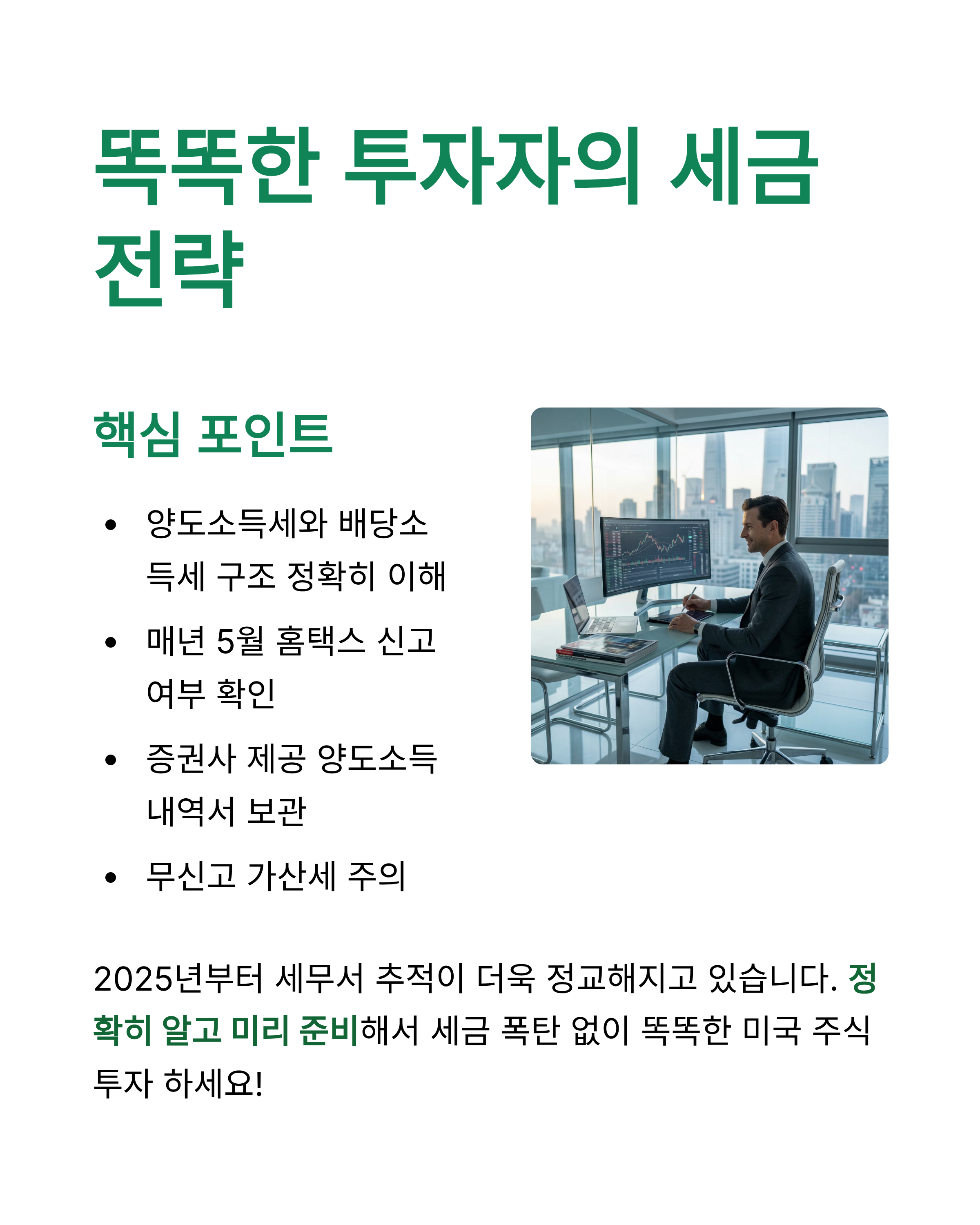 미국 주식 투자 시 꼭 알아야 할 세금 정보 총정리! 양도소득세, 배당세, 세율, 신고 방법, 주의사항까지 2025년 기준으로 쉽게 정리했습니다.