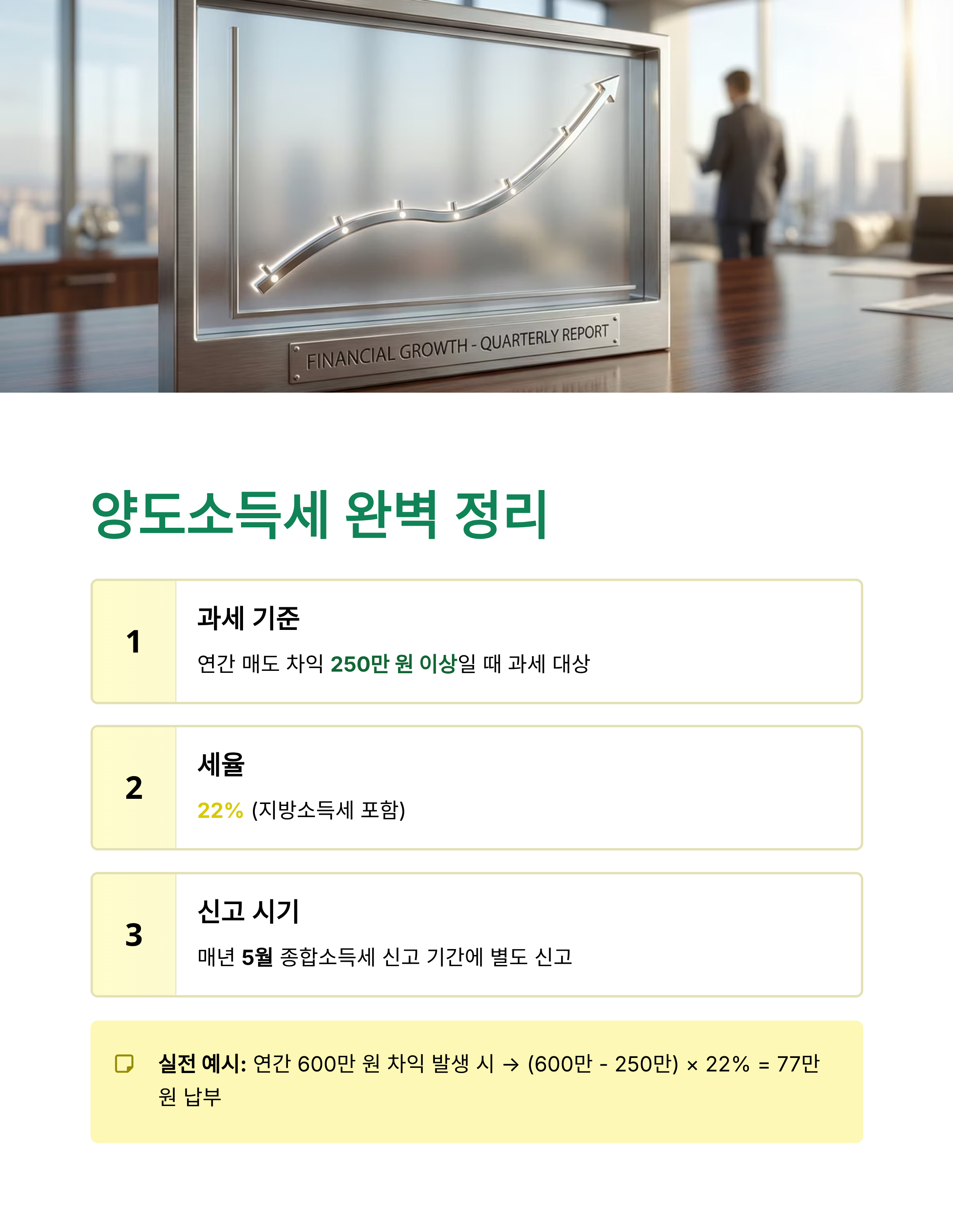 - 과세 대상: 매도 차익이 250만 원 이상일 때
