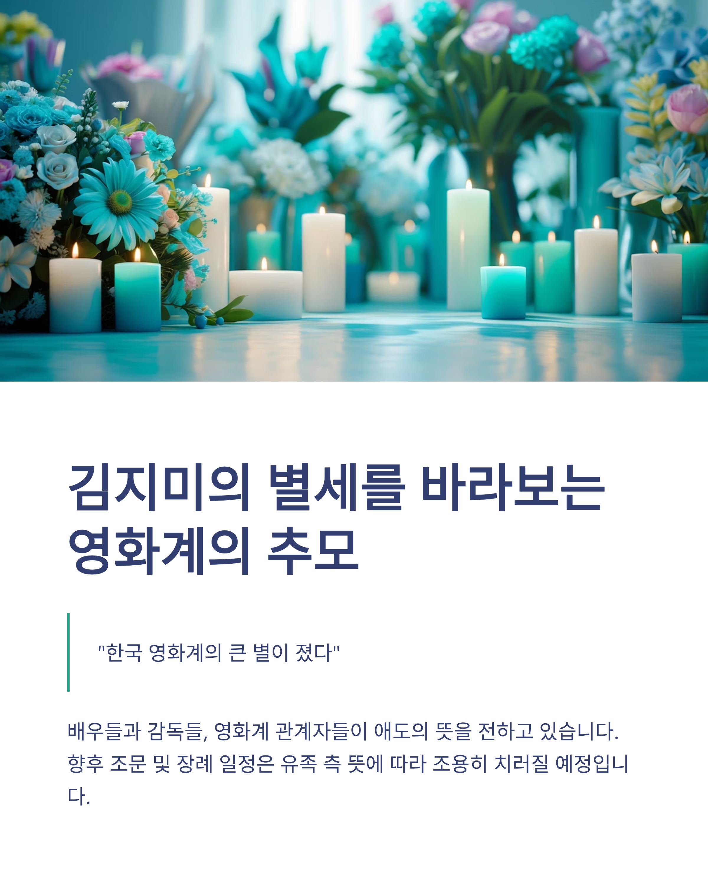 배우들과 감독들, 영화계 관계자들은 그녀의 별세 소식에 "한국 영화계의 큰 별이 졌다"며 애도의 뜻을 전하고 있습니다. 향후 조문 및 장례 일정은 유족 측 뜻에 따라 조용히 치러질 예정입니다.