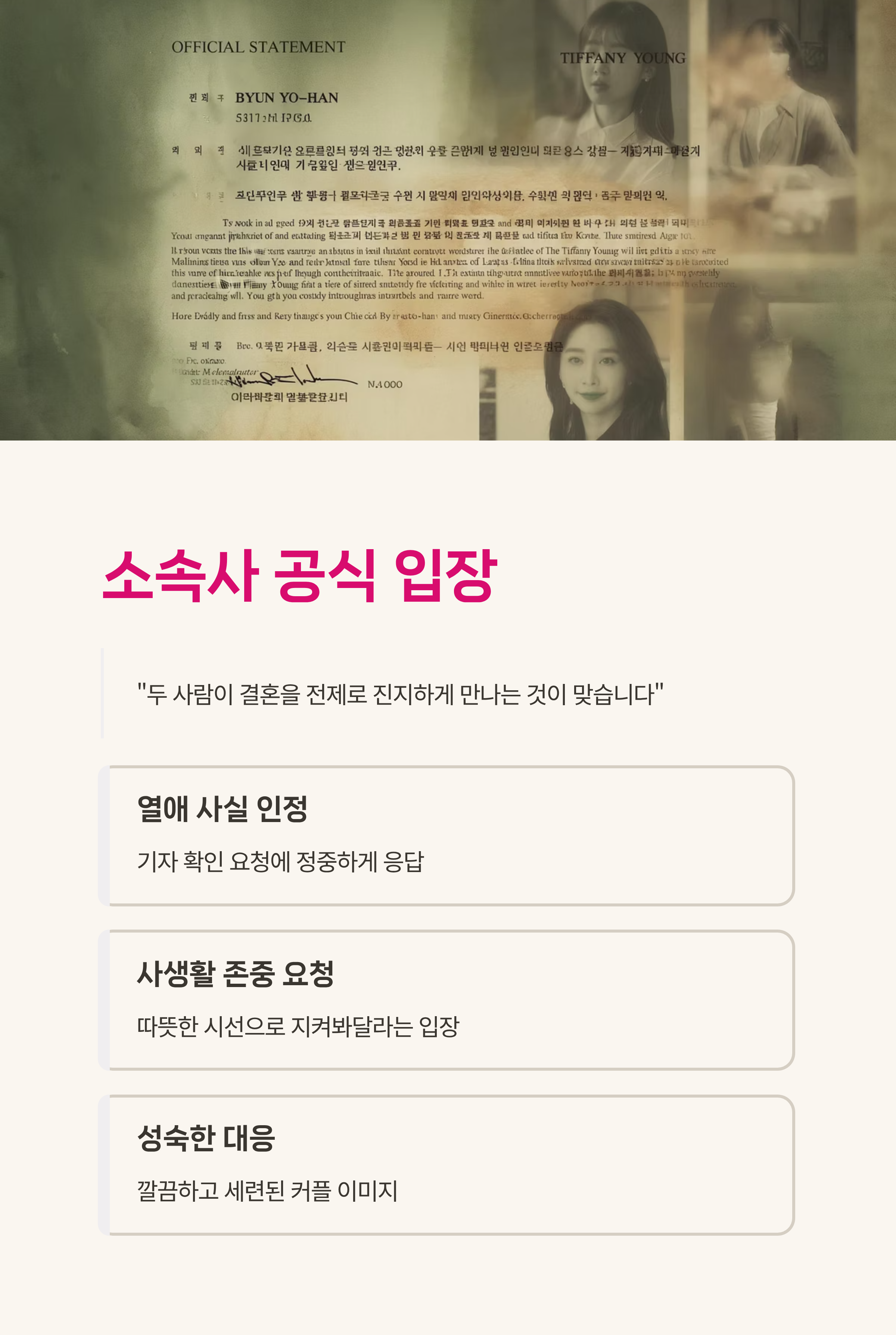 이번 인정은 기자들의 확인 요청에 정중하게 응답하는 방식으로 이뤄져, 깔끔하고 성숙한 커플의 이미지를 보여주고 있어요.