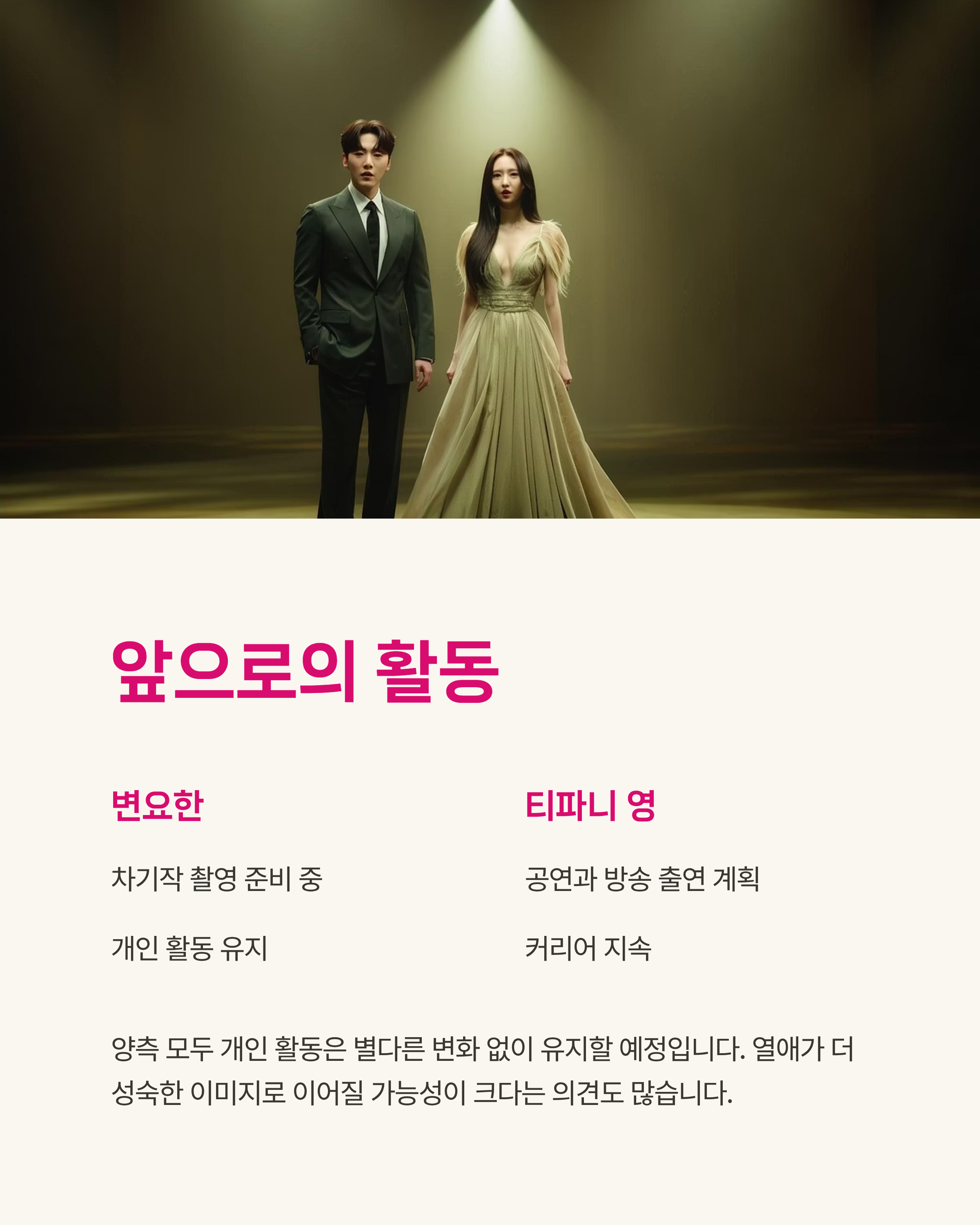 변요한은 차기작 촬영을 준비 중이며, 티파니는 공연과 방송 출연을 이어갈 계획입니다.
