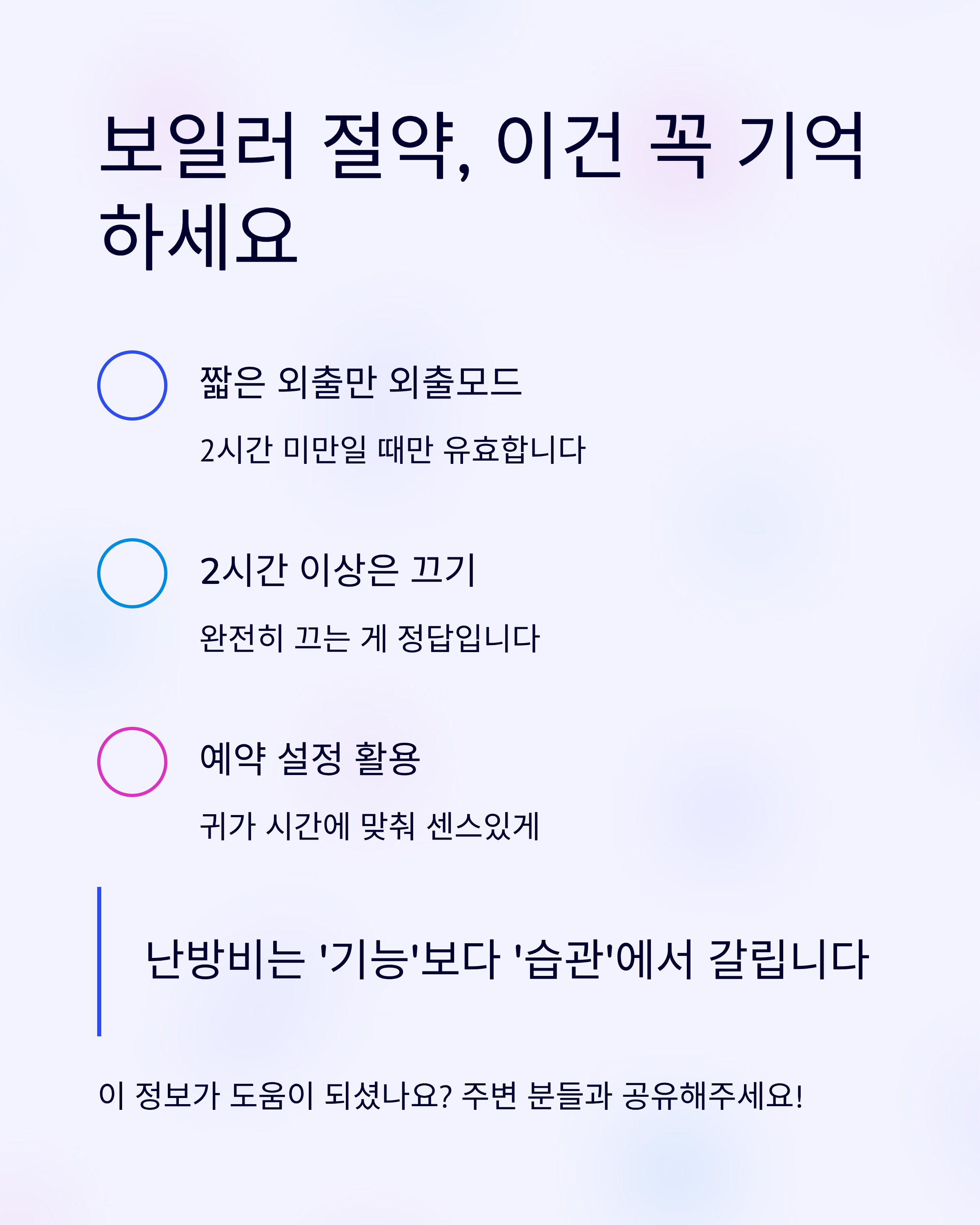 겨울철 난방비 걱정에 보일러 외출모드를 활용하는 분들 많으시죠? 하지만 정말 이 기능이 난방비를 아껴주는 걸까요? 알고 보면 외출모드를 켜는 것보다 더 효율적인 절약법이 따로 있다는 사실, 알고 계셨나요? 이번 글에서는 보일러 외출모드의 정확한 기능과 오해, 진짜 난방비를 아끼는 똑똑한 방법들을 정리해드립니다.