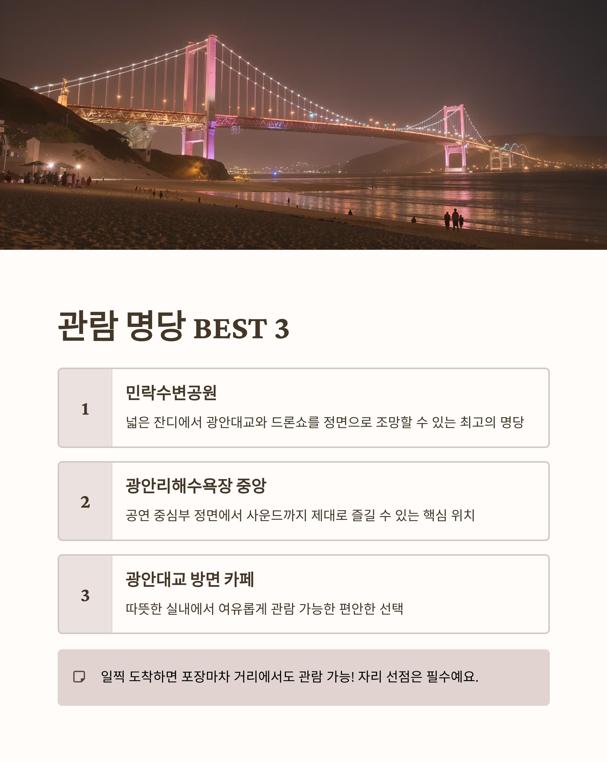 | 민락수변공원 | 넓은 잔디, 정면에서 광안대교+드론쇼 조망 가능 |