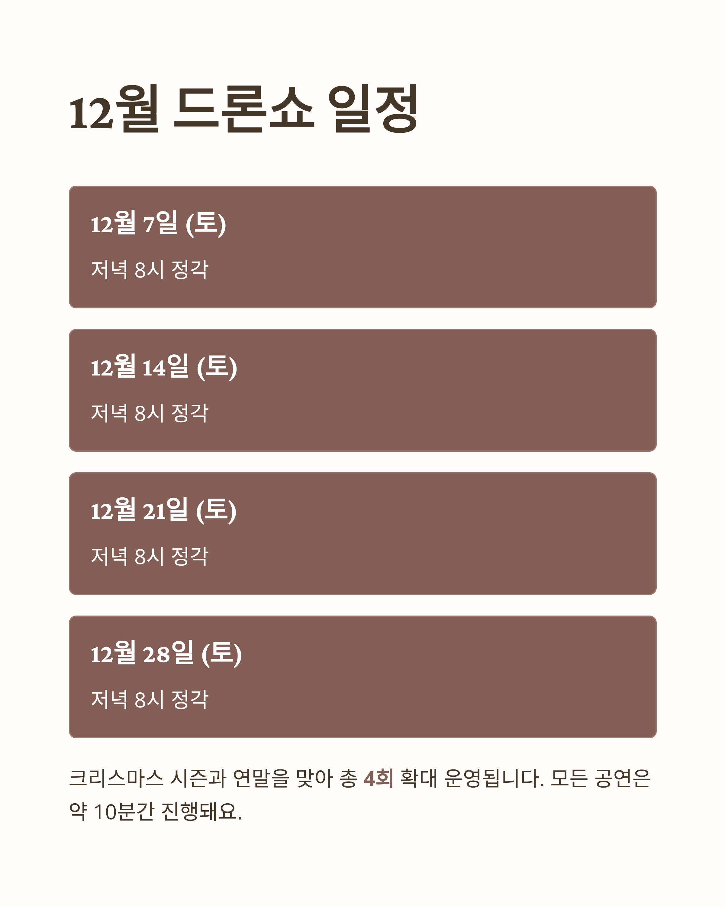 모든 드론쇼는 저녁 8시 정각에 시작되며, 약 10분간 이어지는 공연이에요.