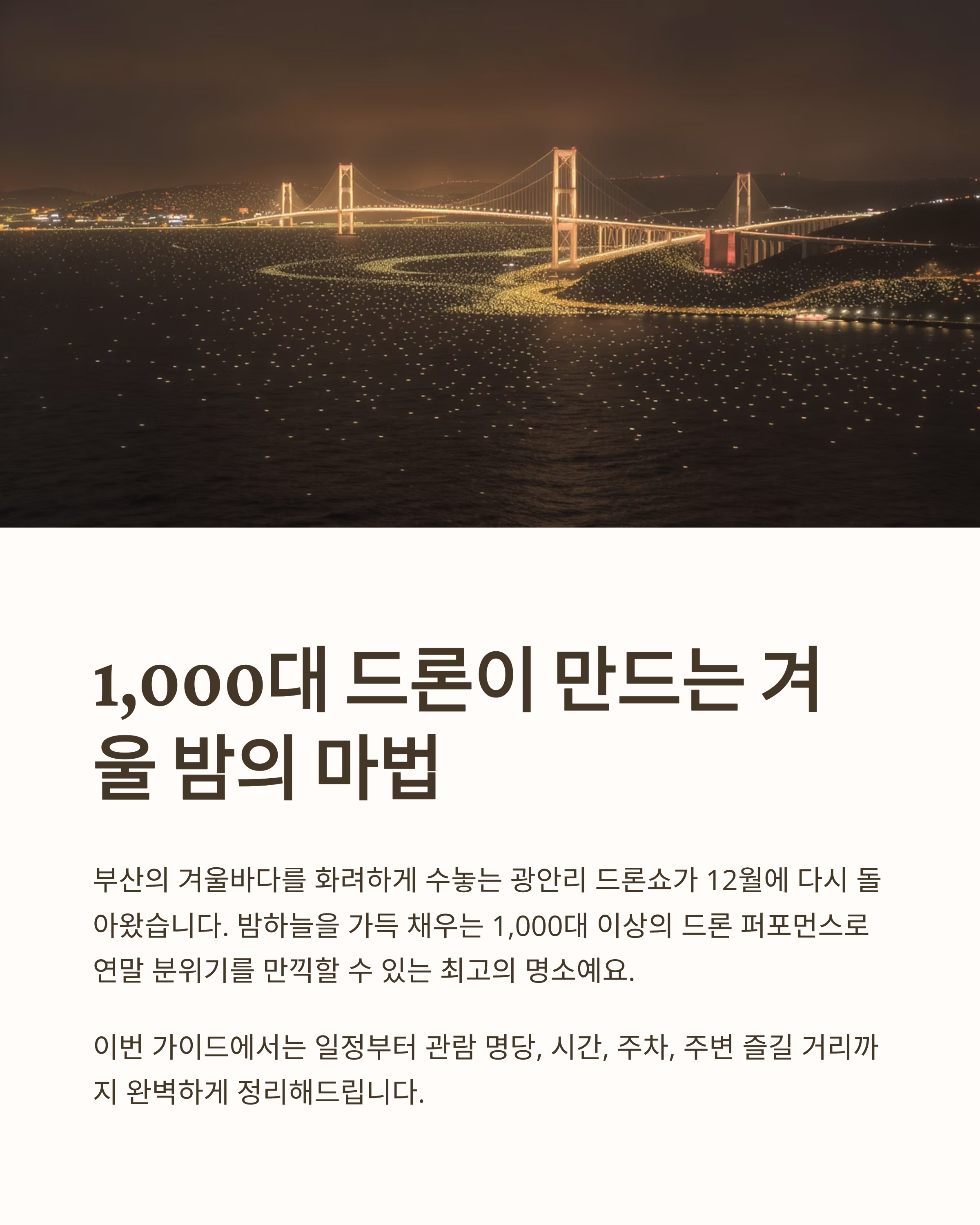 부산의 겨울바다를 수놓는 가장 낭만적인 밤, 바로 광안리 드론쇼입니다. 12월을 맞아 다시 돌아온 드론쇼는 밤하늘을 화려하게 수놓는 1,000대 이상의 드론 퍼포먼스로, 연말 분위기를 물씬 느낄 수 있는 인기 명소로 자리잡았는데요. 이번 글에서는 12월 광안리 드론쇼 일정부터 관람 명당, 시간, 주차, 주변 즐길 거리까지 완벽하게 정리해드릴게요.