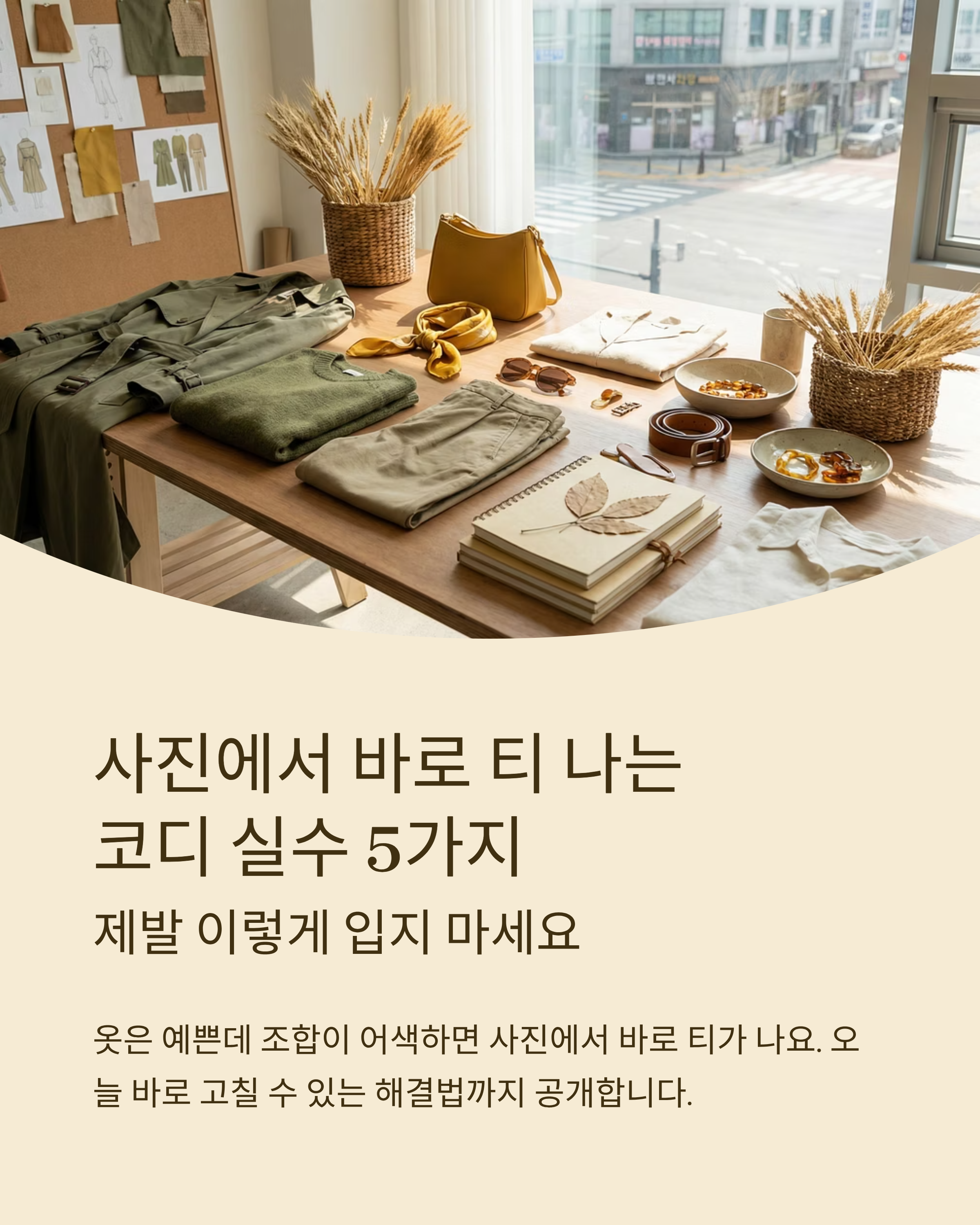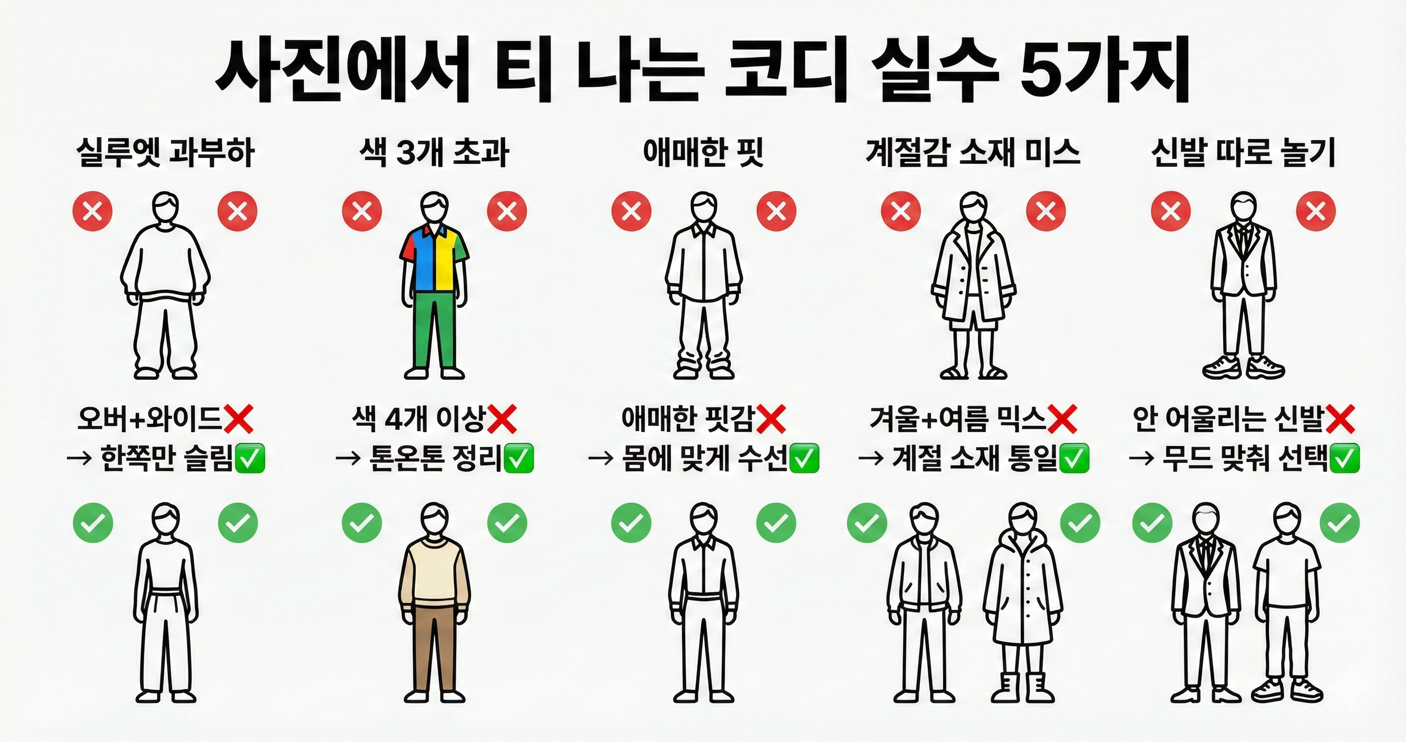 메타 설명: 사진에서 바로 티 나는 코디 실수 5가지를 정리하고, 실루엣·색 조합·사이즈·계절 소재·신발 매치까지 실패를 줄이는 현실적인 해결법과 3초 체크리스트를 함께 소개합니다.