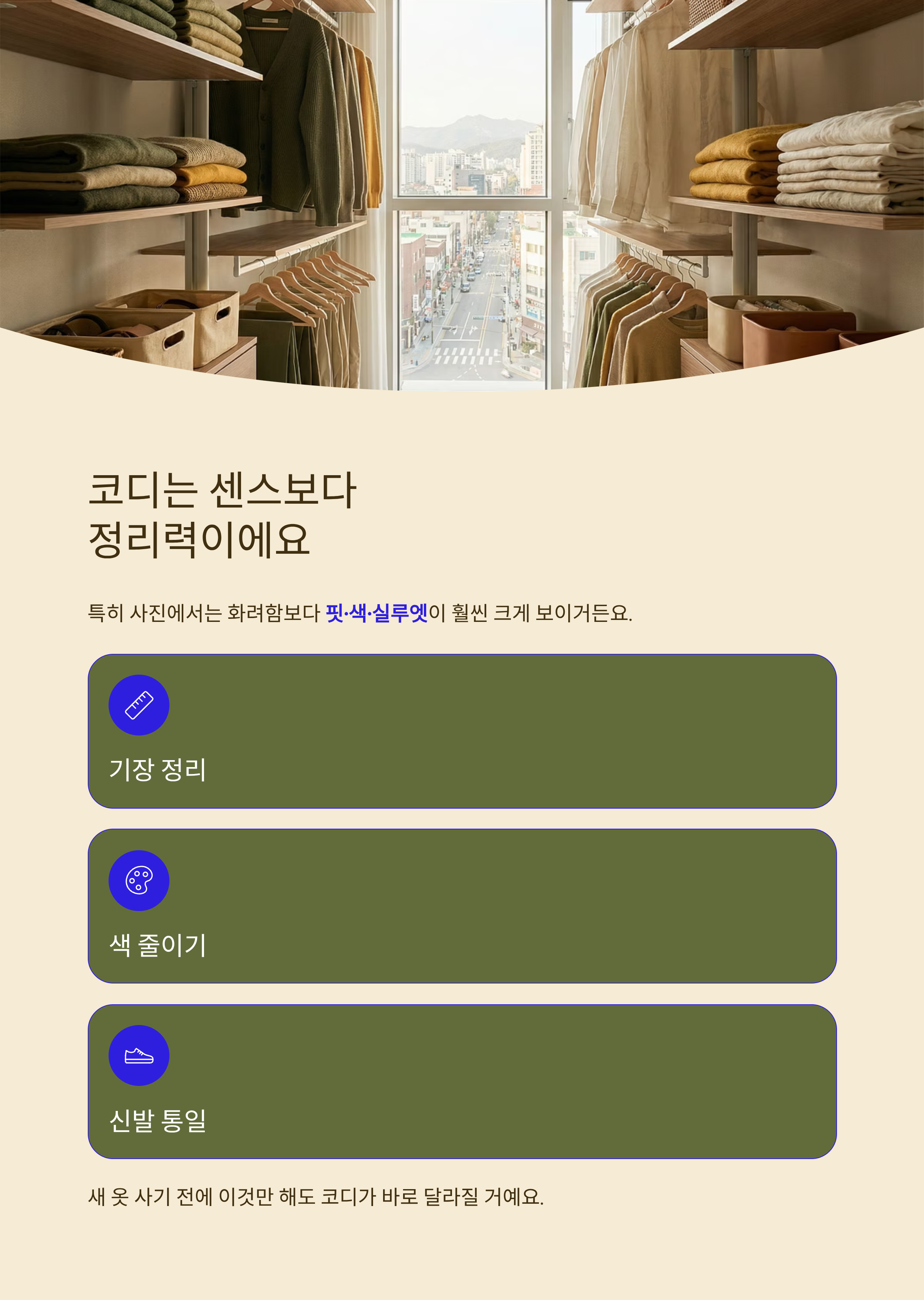 기장 정리 + 색 줄이기 + 신발 통일만 해도, 코디가 바로 달라질 거예요.