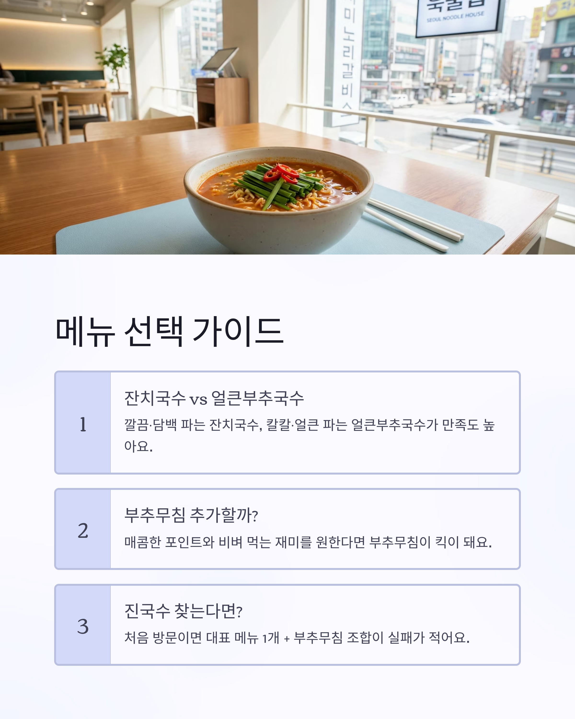 가장 추천하는 조합은 간단합니다. 대표 국수 1개 + (가능하면) 부추무침.