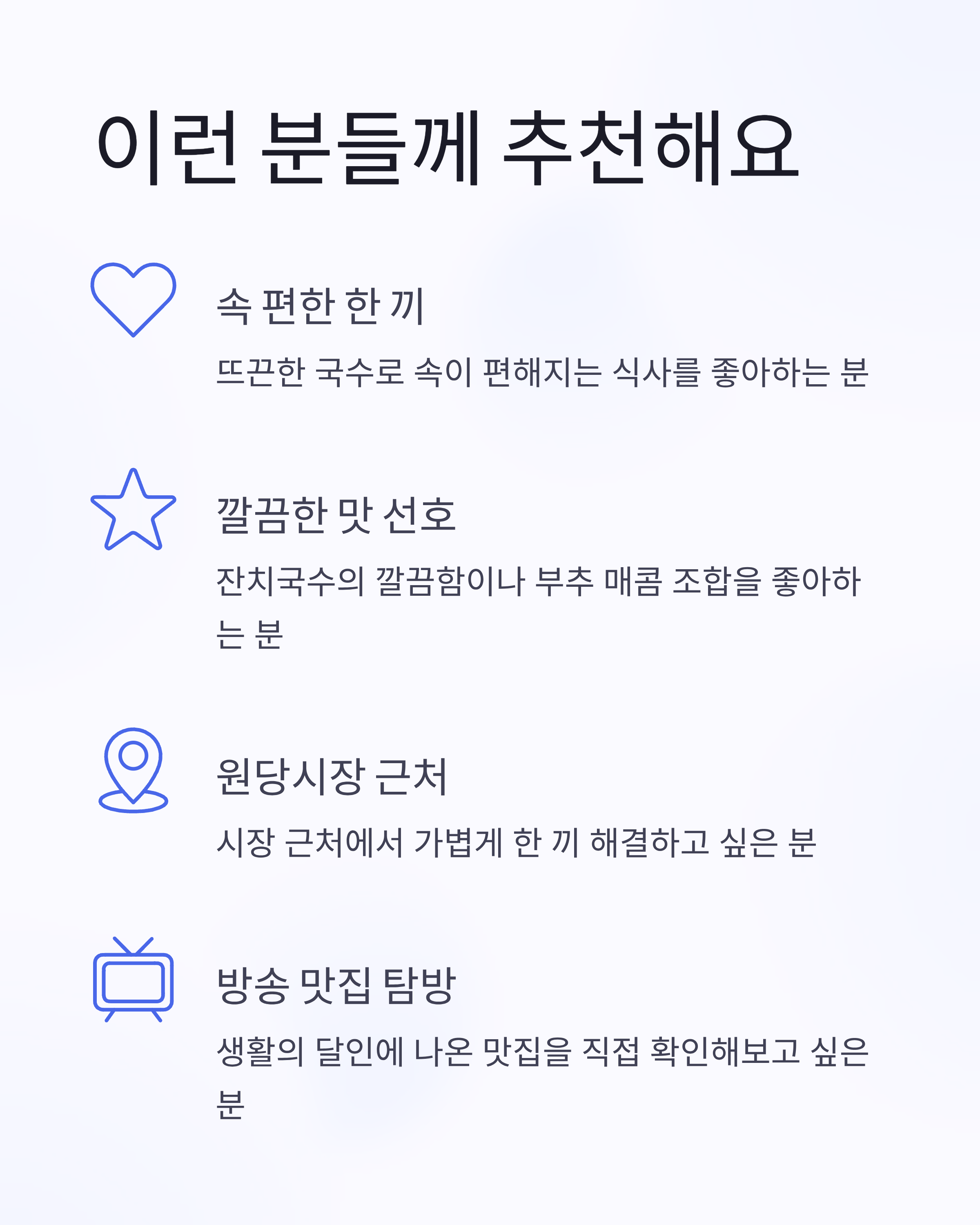 방송 이후로 “국수 한 그릇이 왜 이렇게 궁금하지?” 싶은 분들이 확 늘었죠. 특히 원당시장 근처에서 국수 맛집을 찾는 분들이라면 한 번쯤 리스트에 넣어보게 되는 곳이에요.