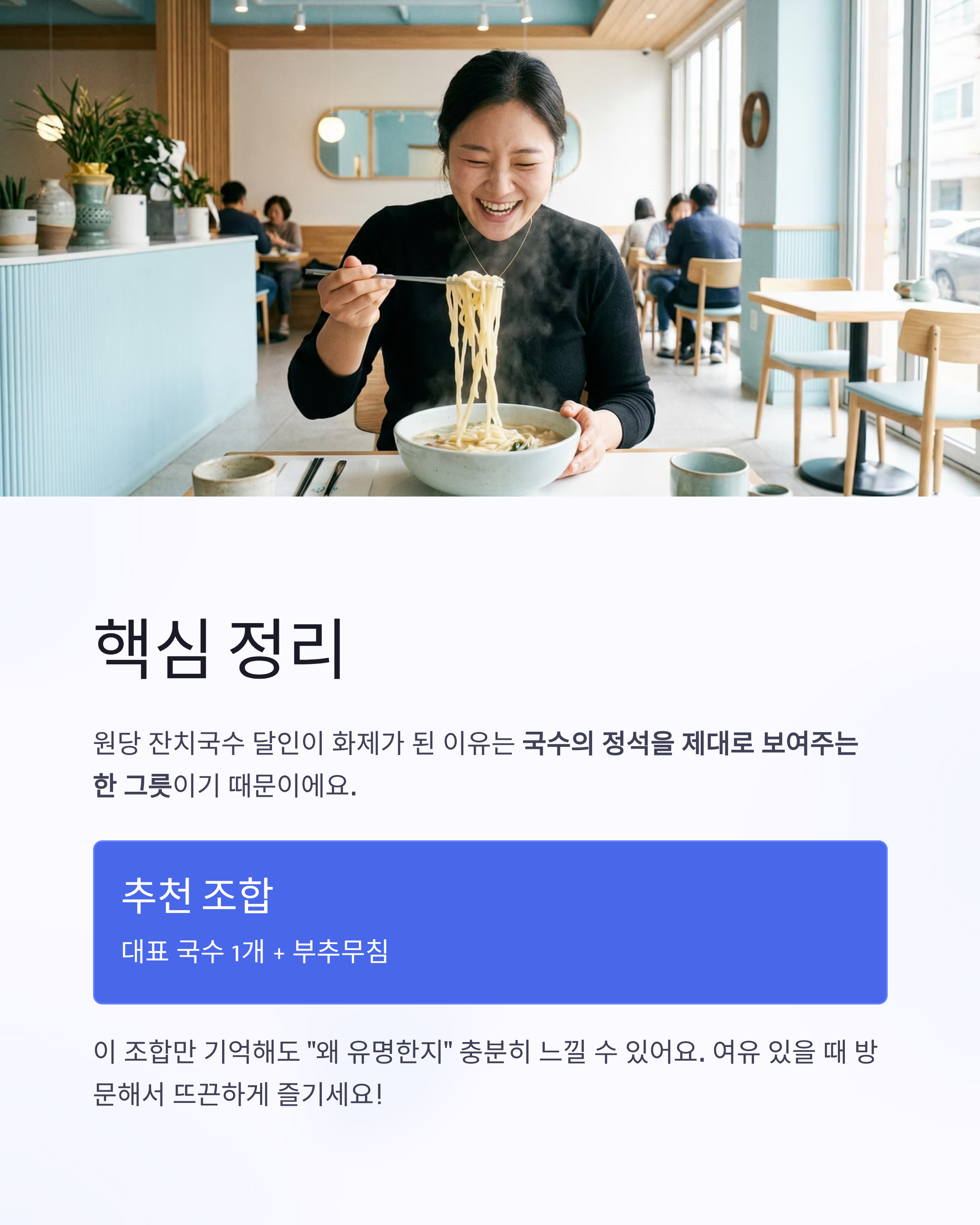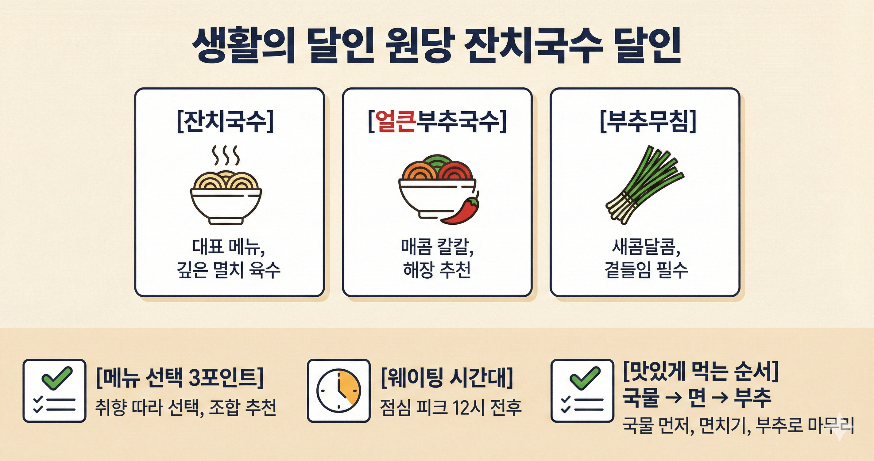 메타 설명: 생활의 달인 ‘원당 잔치국수 달인’으로 화제가 된 원당 국수 맛집을 방문하기 전 알아둘 메뉴 선택 팁(잔치국수 vs 얼큰부추국수), 부추무침 조합, 웨이팅 피하는 시간대, 맛있게 먹는 순서와 방문 체크리스트를 한 번에 정리했습니다.