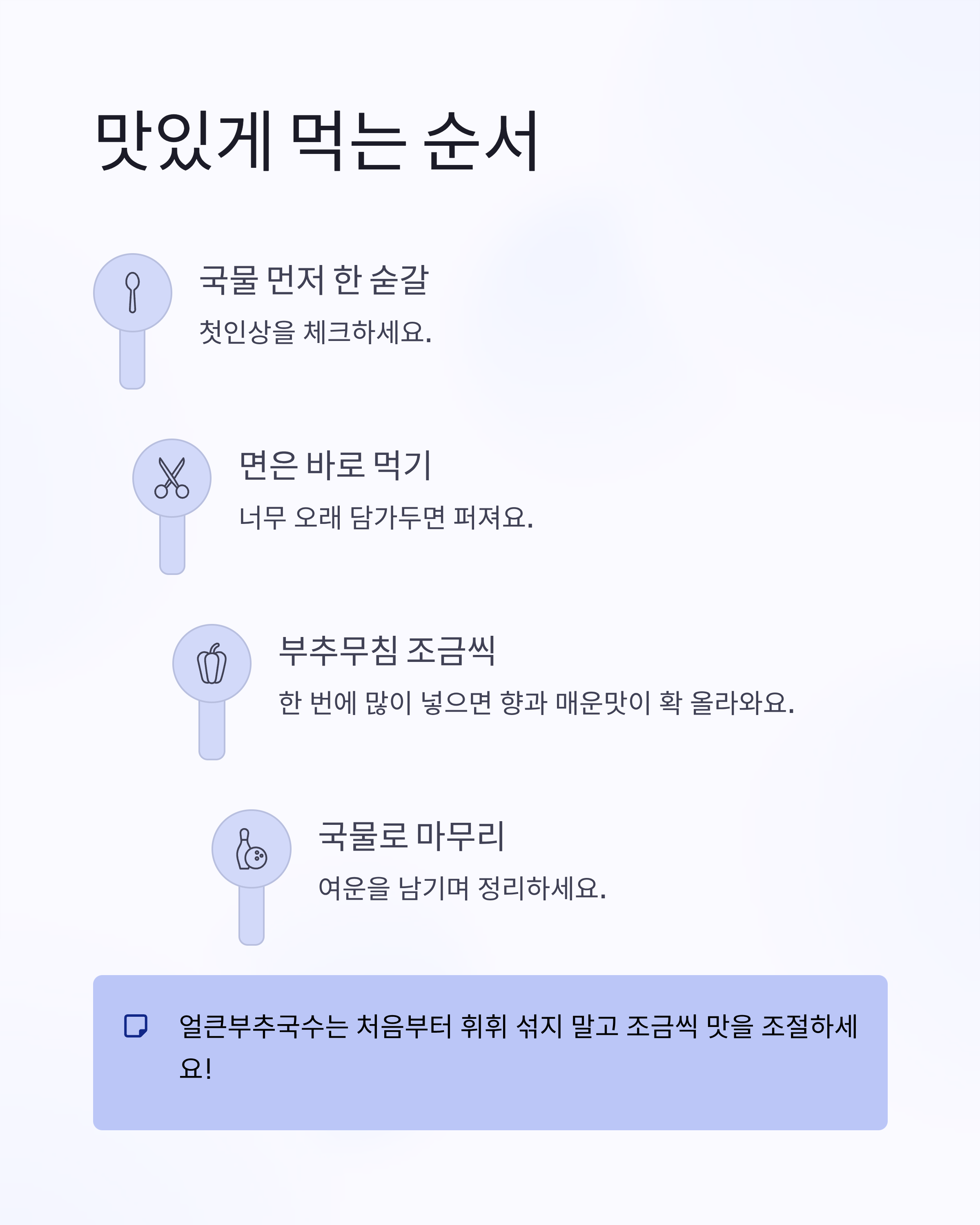 국수는 먹는 순서만 바꿔도 인상이 달라져요.
