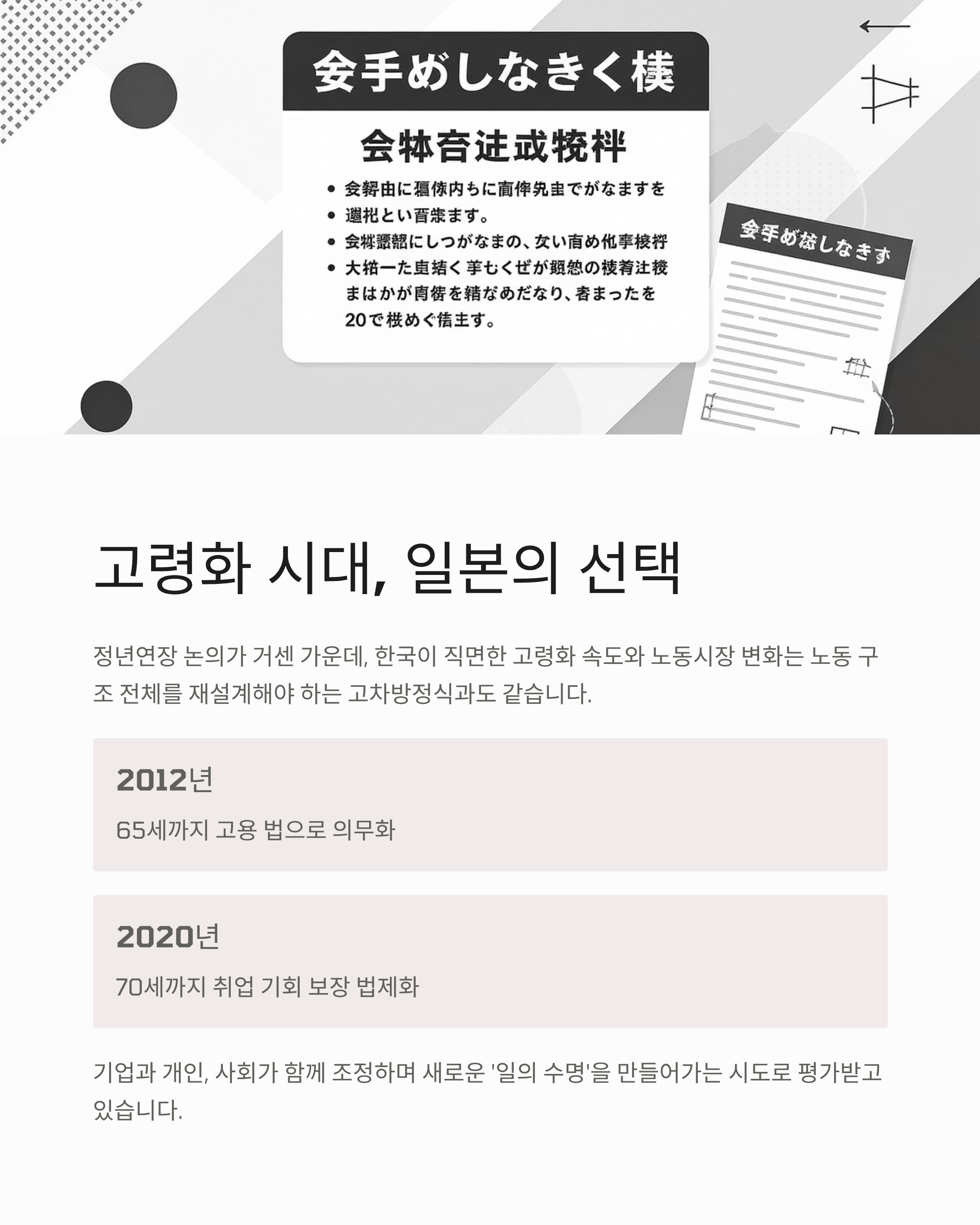 일본은 이미 2012년부터 65세까지의 고용을 법으로 의무화하고, 2020년에는 70세까지 취업 기회를 보장하는 방안을 법제화했습니다. 이 제도는 단순한 정년연장이 아닌, 기업과 개인, 사회가 함께 조정하며 새로운 ‘일의 수명’을 만들어가는 시도로 평가받고 있습니다.