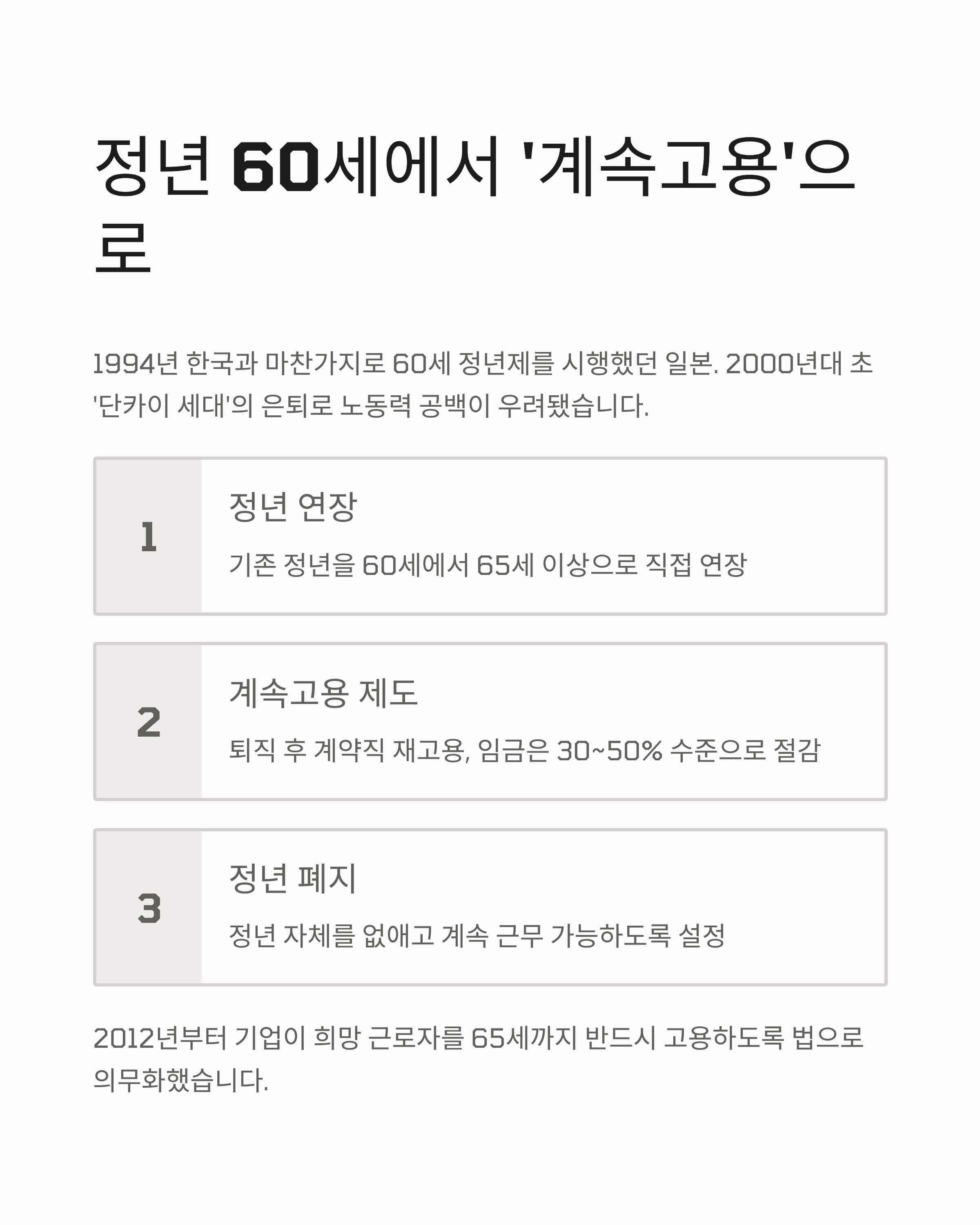 기업들은 인건비 절감을 고려해 ‘계속고용 제도’를 가장 선호했습니다. 일정 나이가 되면 퇴직시키고, 이후에는 계약직으로 재고용하는 방식인데요. 이 방식은 기업 입장에서는 유연한 인건비 운영이 가능했고, 고령자에게는 노동시장에 머무를 수 있는 기회가 제공됐습니다.