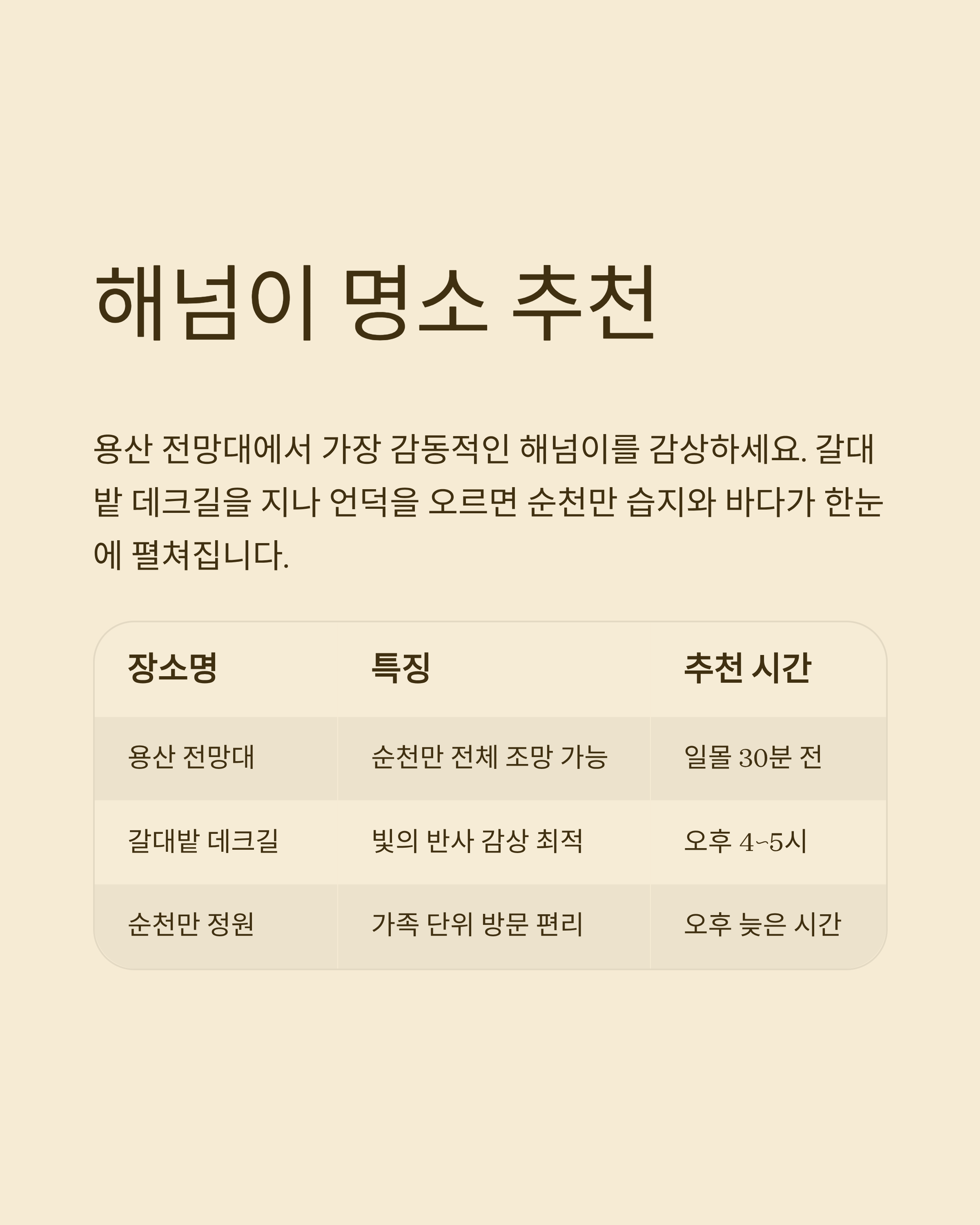 | 용산 전망대 | 순천만 전체 조망 가능 | 일몰 30분 전 도착 |