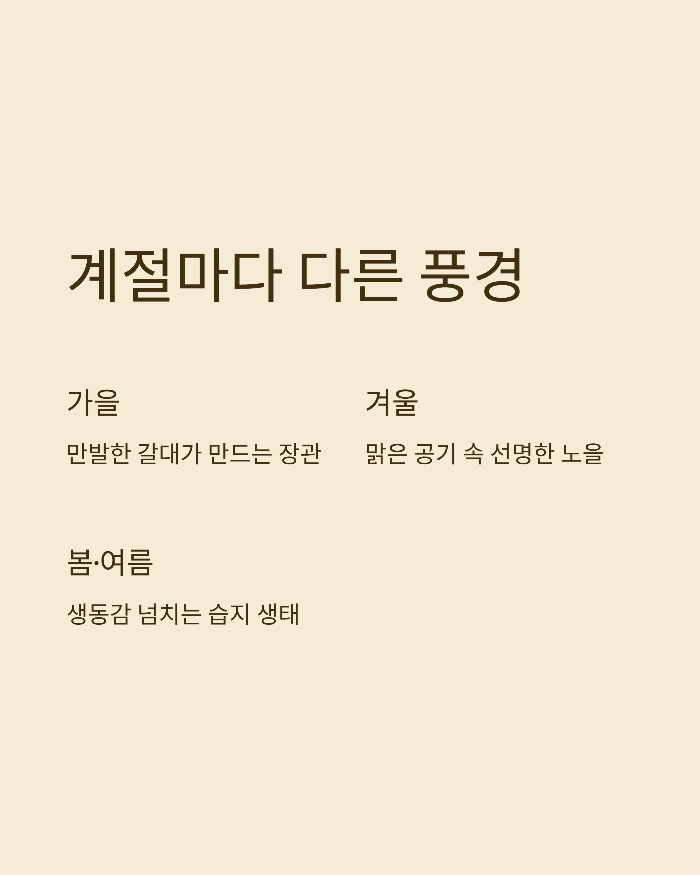 가을엔 갈대가 만발해 장관을 이루고, 겨울엔 맑은 공기 덕분에 선명한 노을을 감상할 수 있습니다.