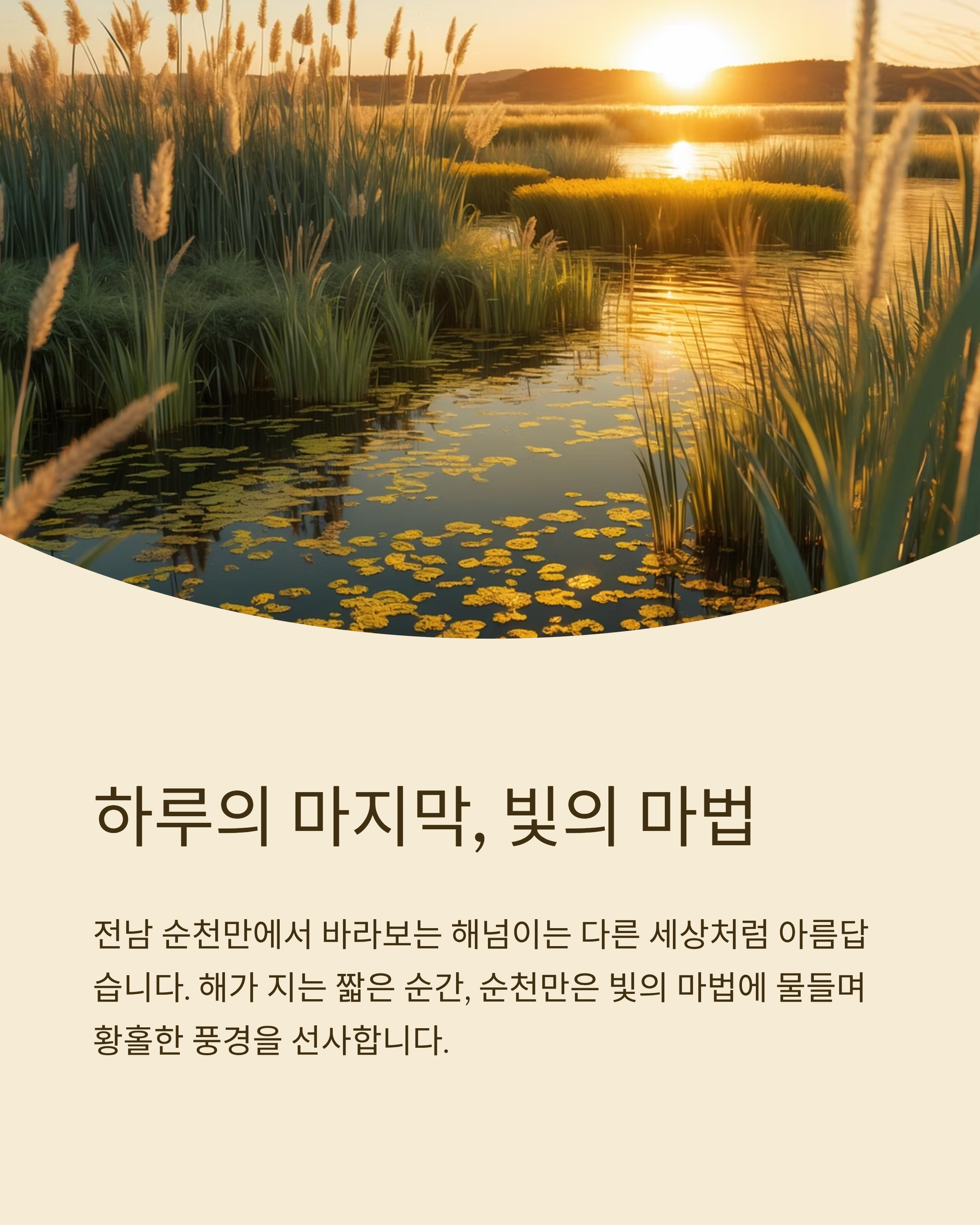 전남 순천에 가면 하루의 마지막이 얼마나 아름다울 수 있는지를 실감하게 됩니다.