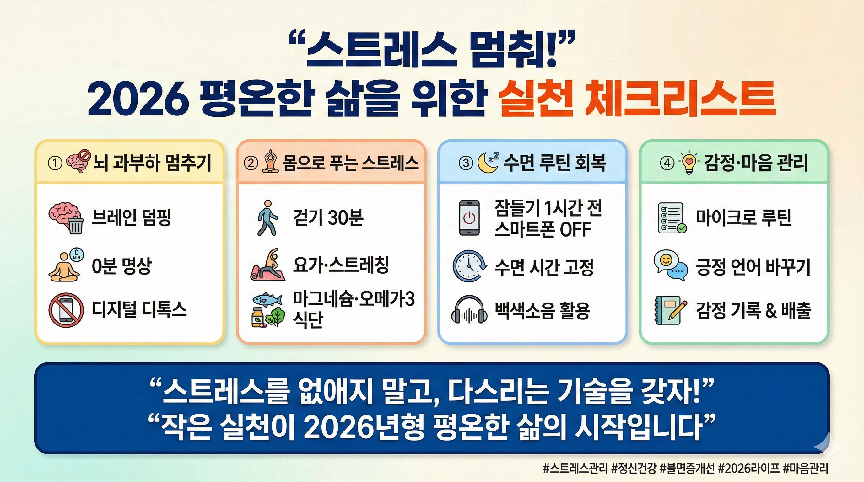2026년, 스트레스 없는 평온한 삶을 원하신다면 지금 꼭 알아야 할 실천 가능한 스트레스 관리법을 확인하세요. 뇌 과부하 시대에서 벗어나는 가장 현실적인 방법을 안내합니다.