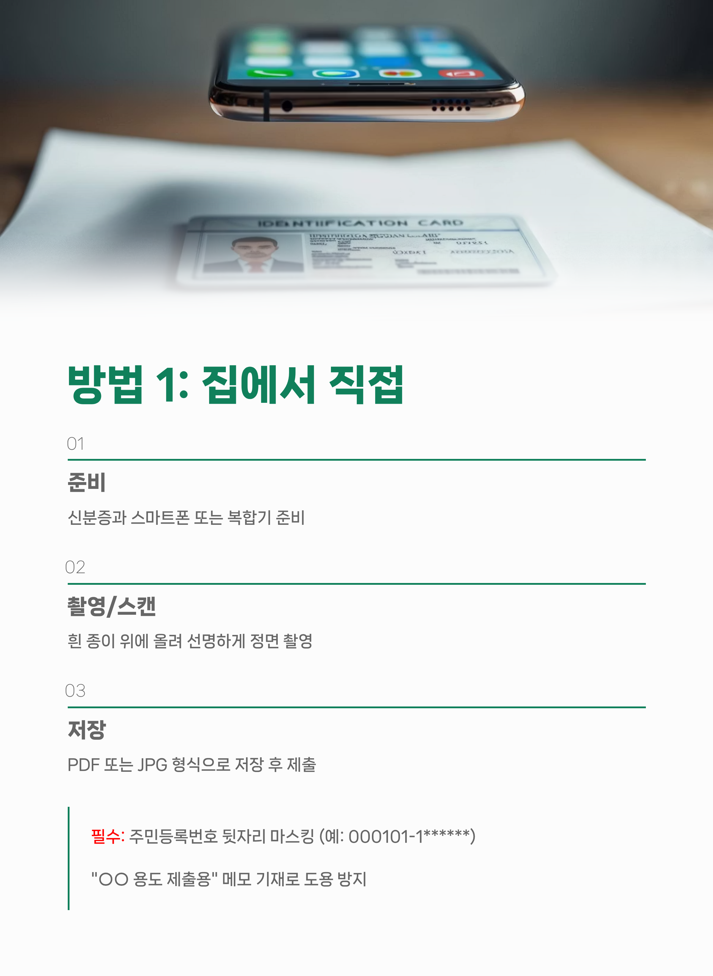 - "○○ 용도 제출용" 메모를 신분증 아래에 기재하면 도용 방지에 도움