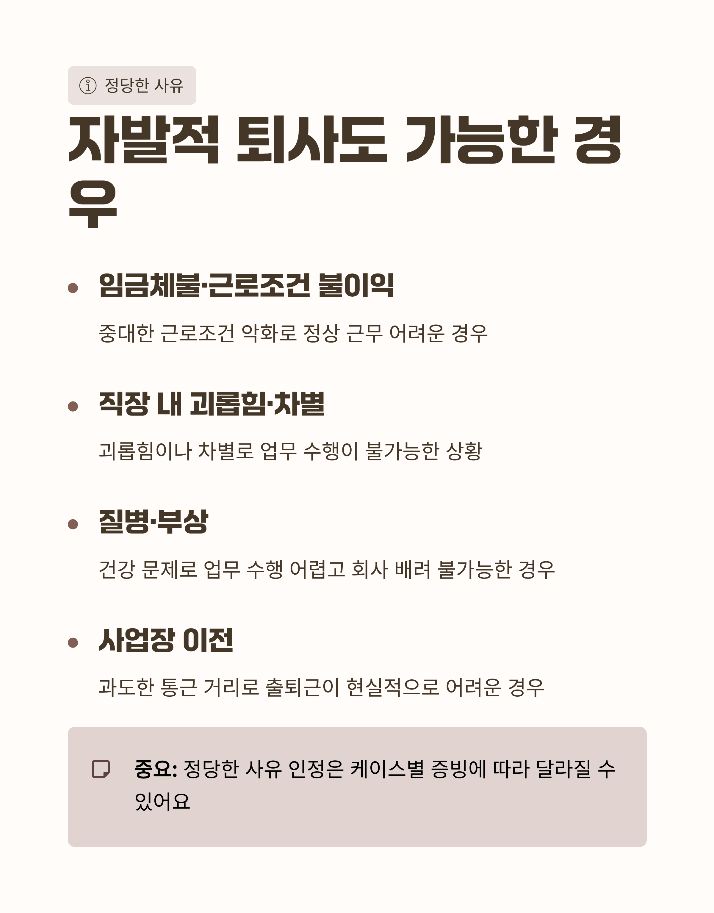 다만 자발적 퇴사여도 “정당한 사유”로 인정되면 가능할 수 있어요. 예를 들면:
