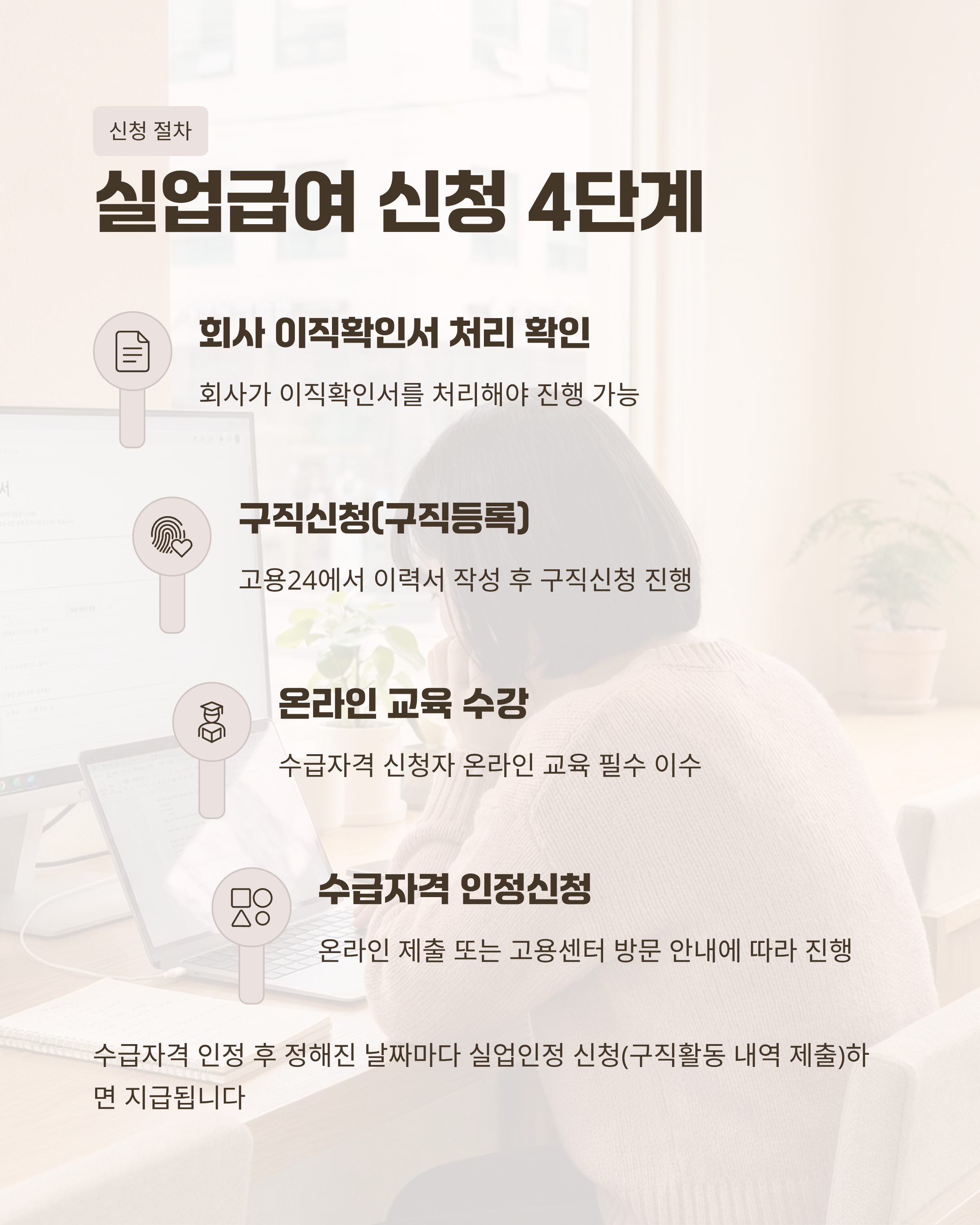 - 수급자격이 인정되면, 정해진 날짜마다 **실업인정 신청(구직활동 내역 제출)**을 합니다.