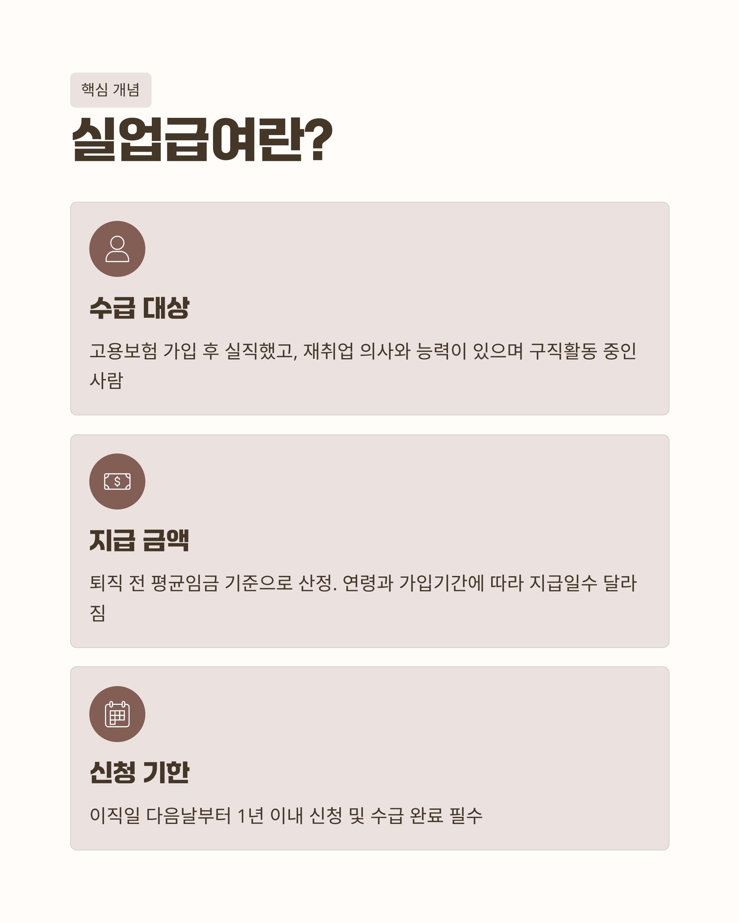- 누가 받나? 고용보험에 가입해 일하다가 실직했고, 다시 일할 의사와 능력이 있으며, **구직활동(재취업 활동)**을 하는 사람