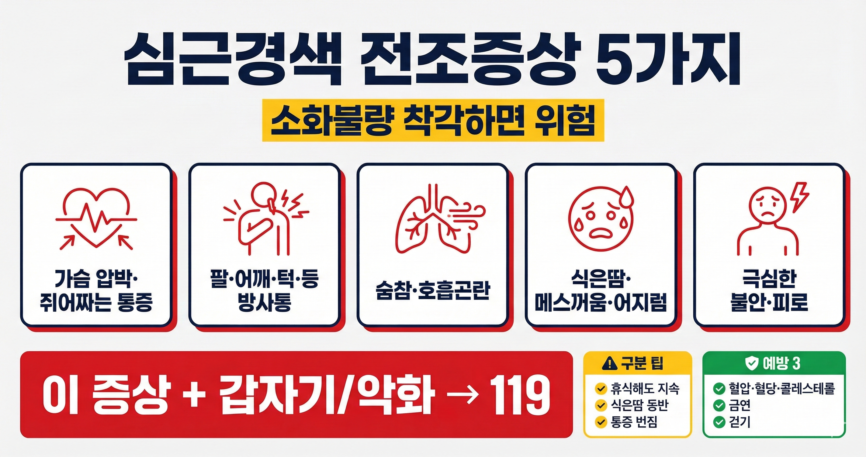 메타 설명: 심근경색 전조증상 5가지(가슴 압박감, 팔·턱·등 방사통, 호흡곤란, 식은땀·메스꺼움·어지럼, 극심한 불안·피로)를 소화불량과 구분하는 포인트와 함께 정리하고, 의심 시 즉시 119를 포함한 대응법과 고위험군·예방 습관까지 한 번에 안내합니다.