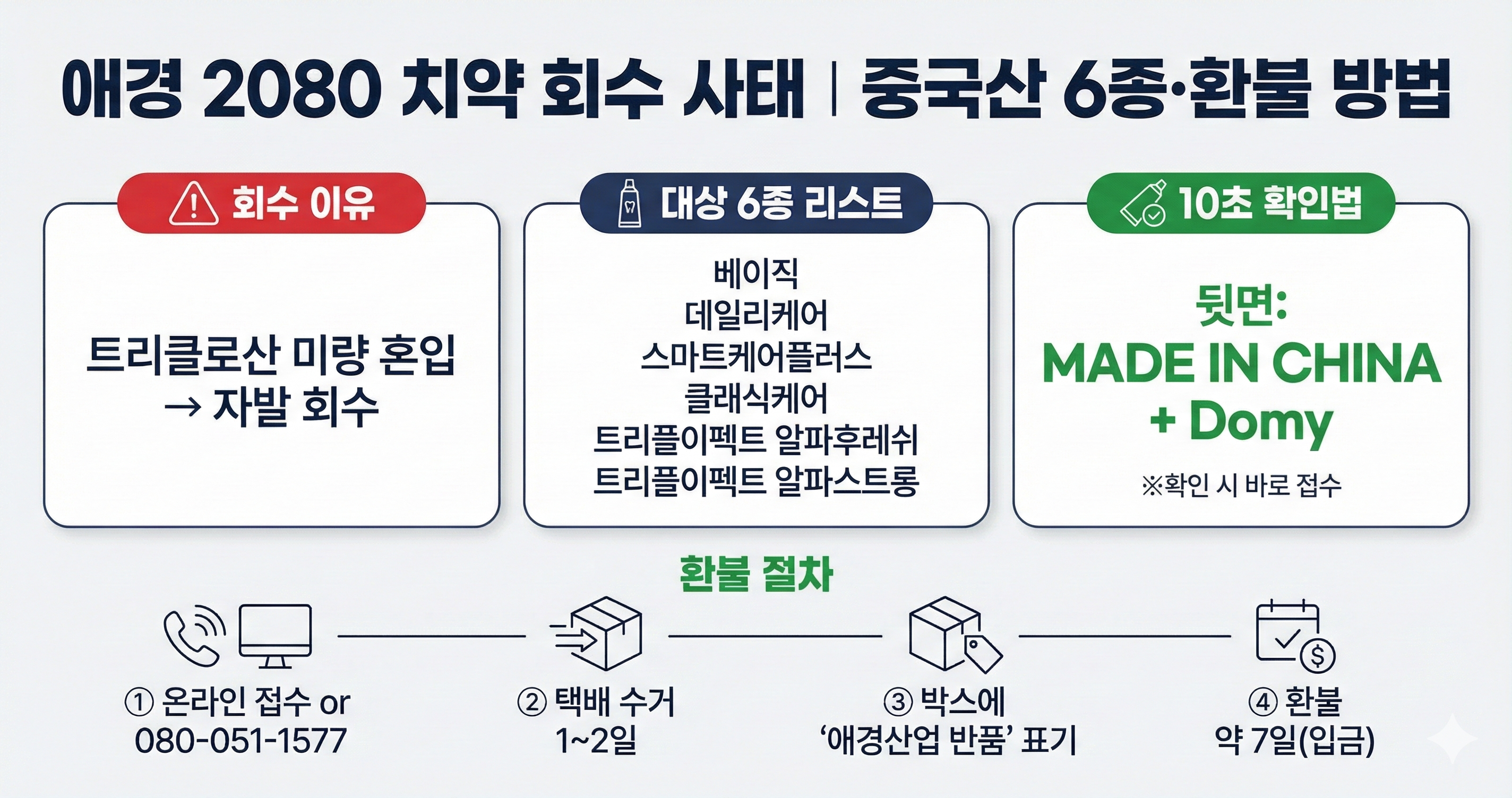 메타 설명: 애경 2080 치약 자발 회수 사태를 한눈에 정리했습니다. 중국 제조사 Domy/MADE IN CHINA 표시가 있는 회수 대상 6종 제품 리스트, 영수증 없이도 가능한 환불 신청 방법(온라인/080-051-1577), 택배 수거 절차(‘애경산업 반품’ 표기)와 환불 소요기간(약 7일 전후)까지 총정리합니다.