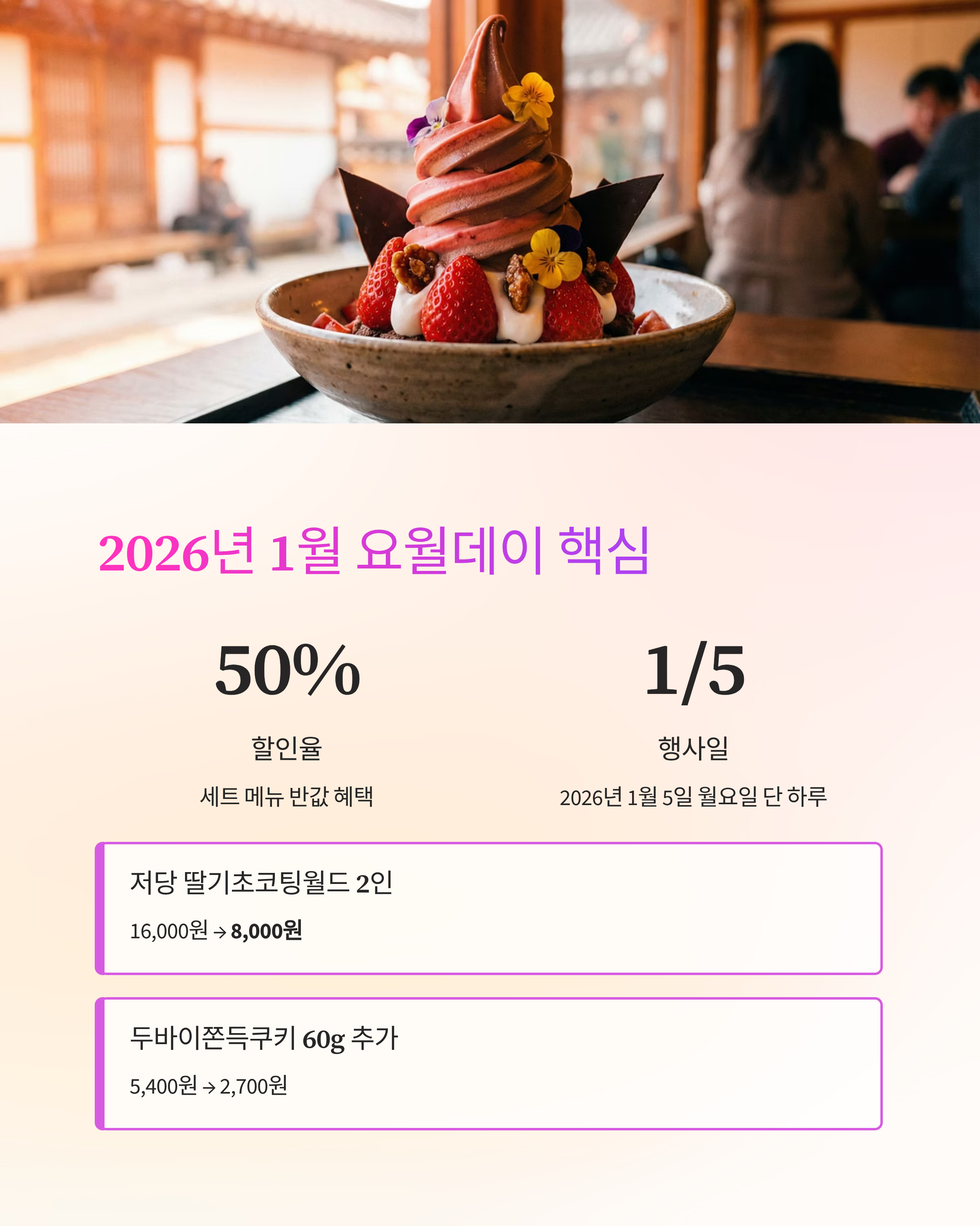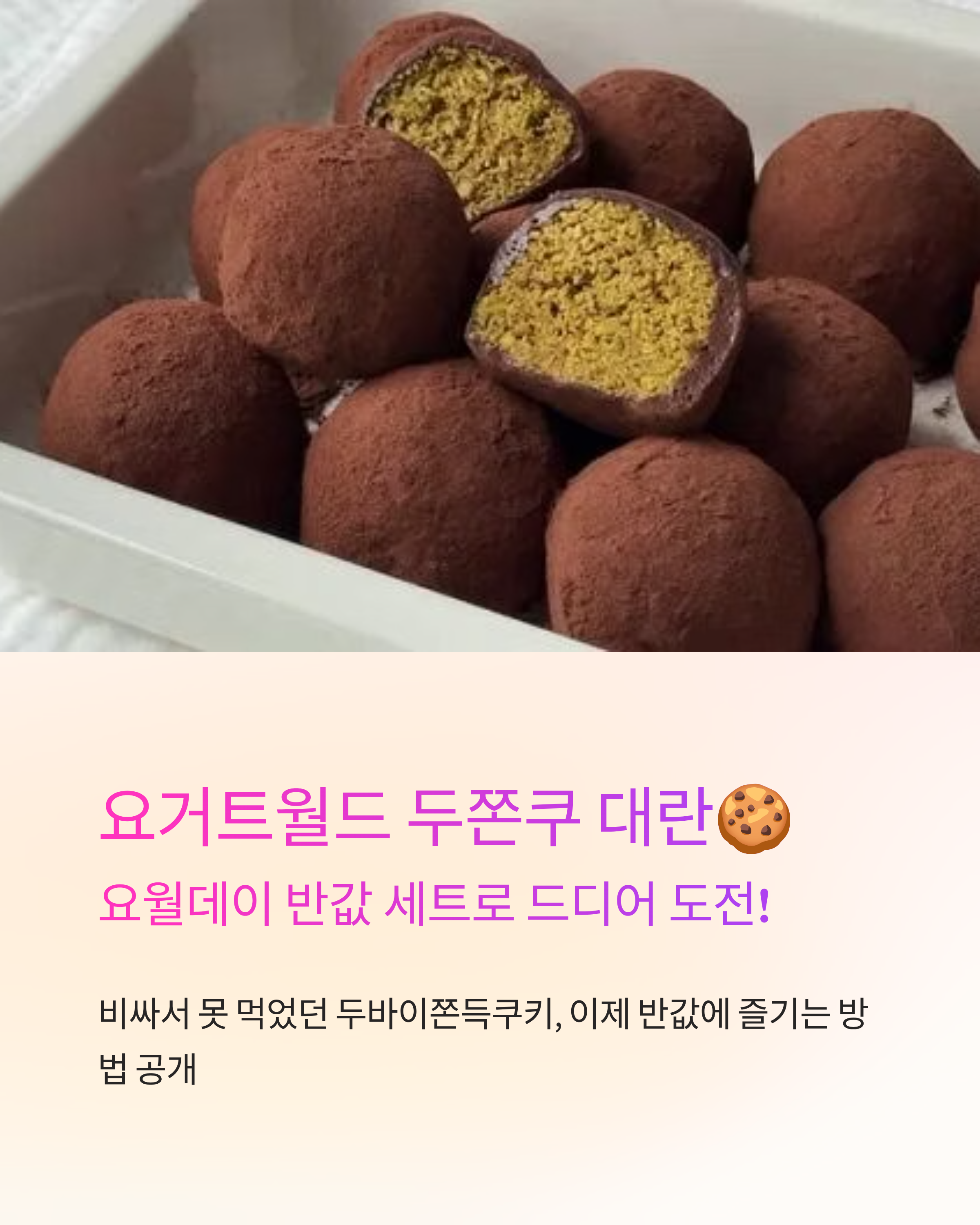 메타 설명: 요거트월드 두바이쫀득쿠키(두쫀쿠)와 2026년 1월 요월데이 반값 세트 혜택을 정리했습니다. 행사일(1/5), 세트 구성(저당 딸기초코팅월드 2인 + 두쫀쿠 60g 추가), 할인 가격(8,000원/2,700원), 매장 참여 여부·품절 대비 구매팁까지 한눈에 확인하세요.