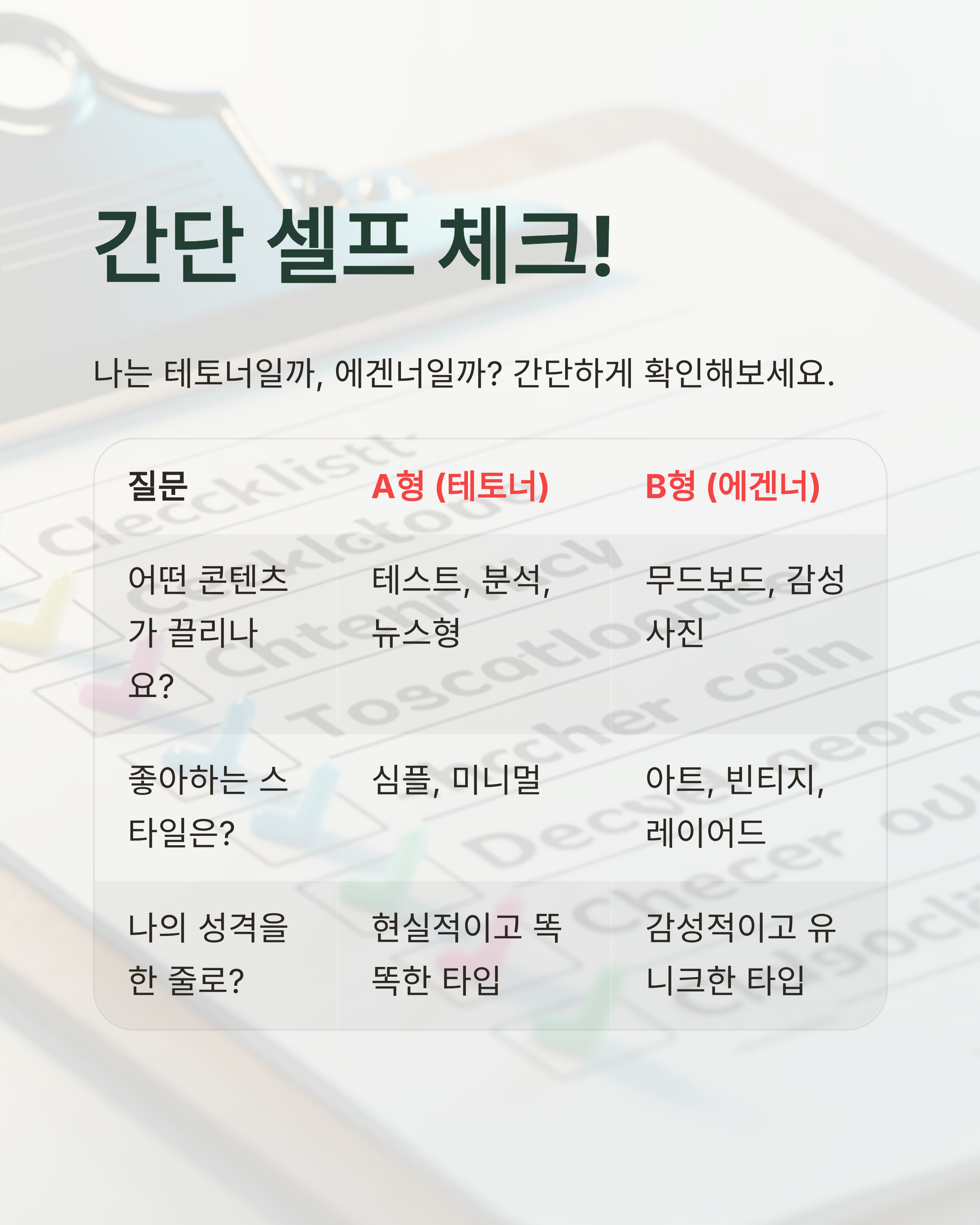 | 어떤 콘텐츠가 끌리나요? | 테스트, 분석, 뉴스형 | 무드보드, 감성 사진 |