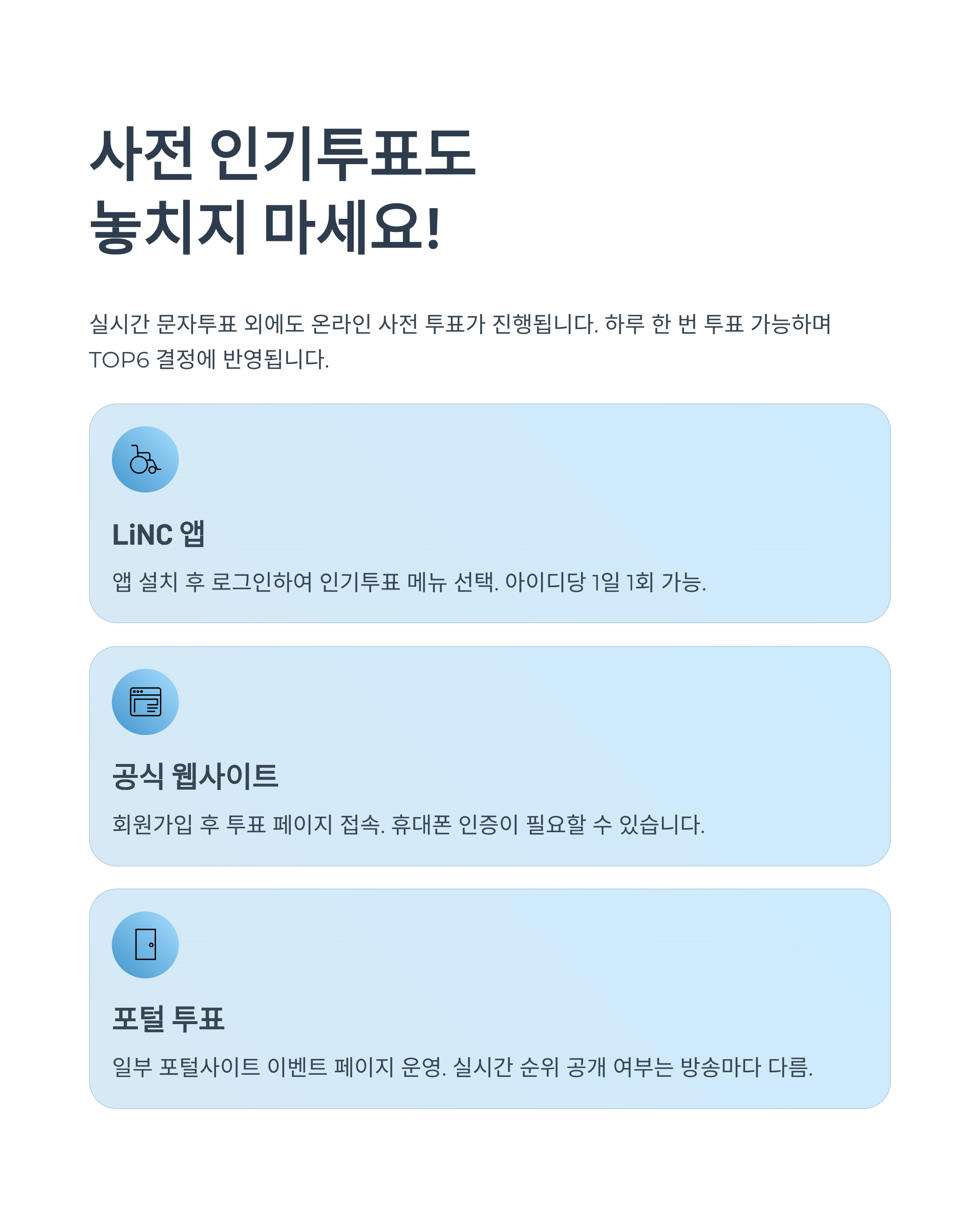 | LiNC 앱 | 앱 설치 후 로그인 → 인기투표 메뉴 선택 | 아이디당 1일 1회 가능 |