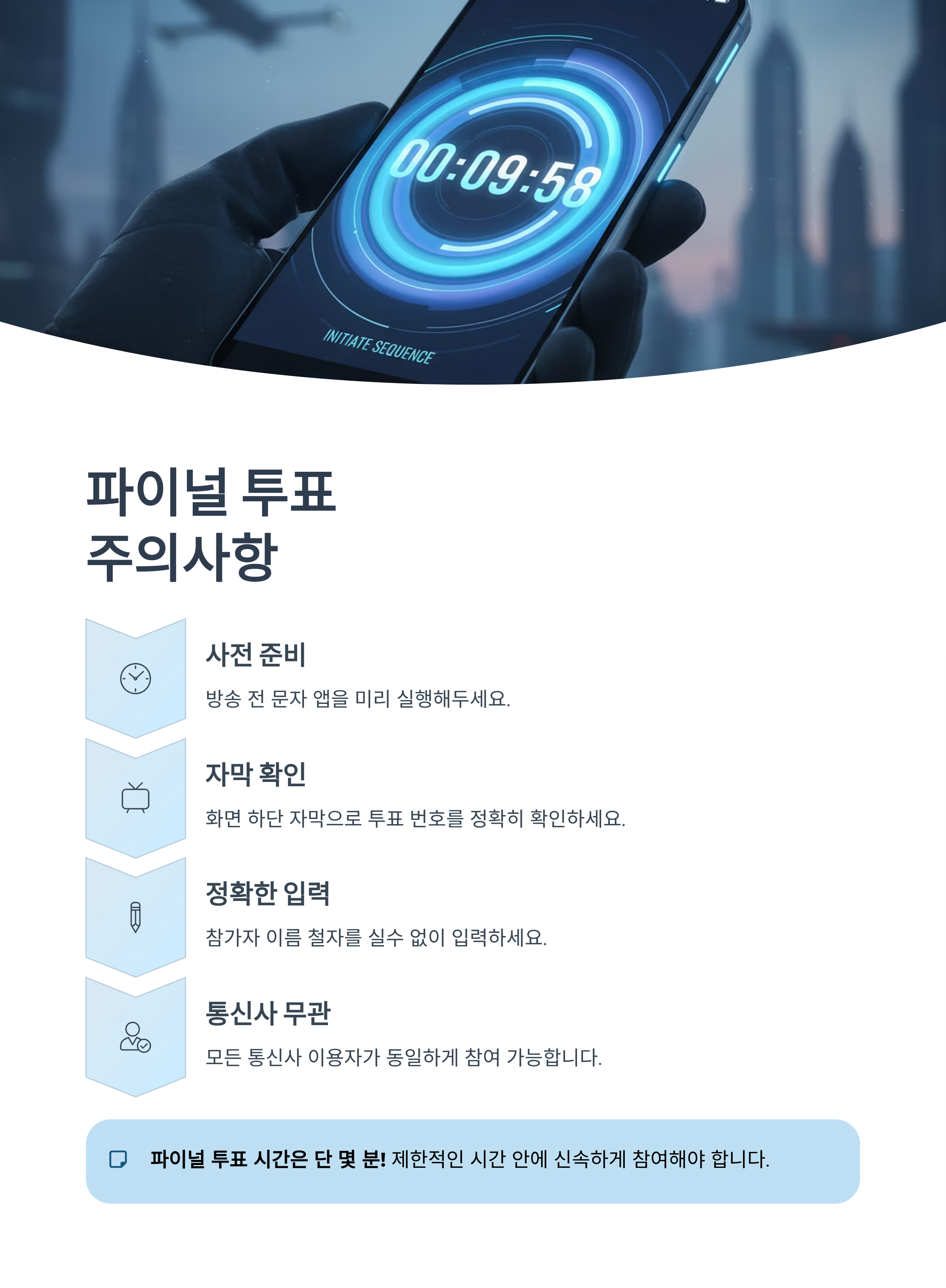 파이널 무대에서는 문자투표 시간이 단 몇 분으로 매우 제한적입니다. 이 때문에 다음 사항들을 미리 숙지해야 합니다.