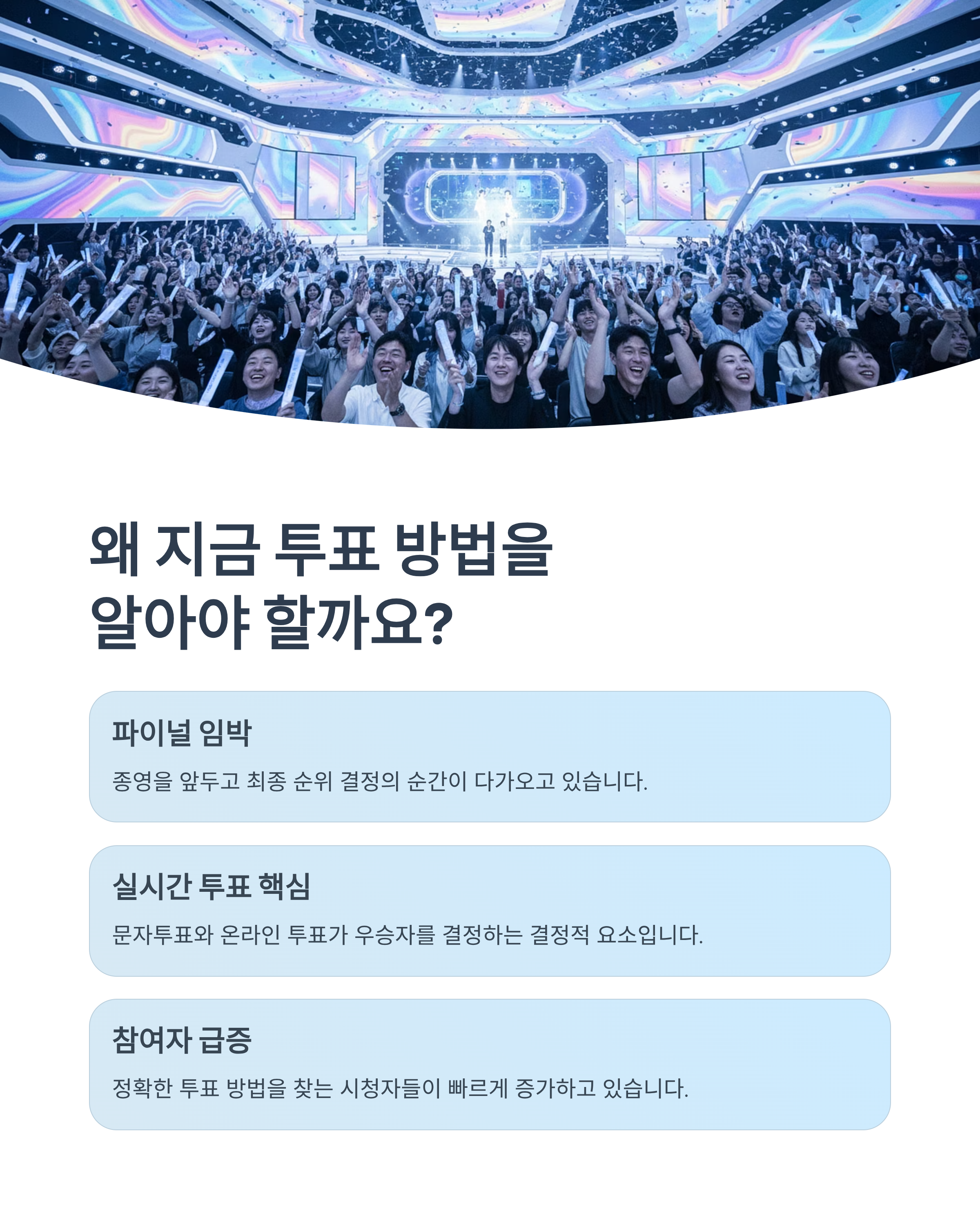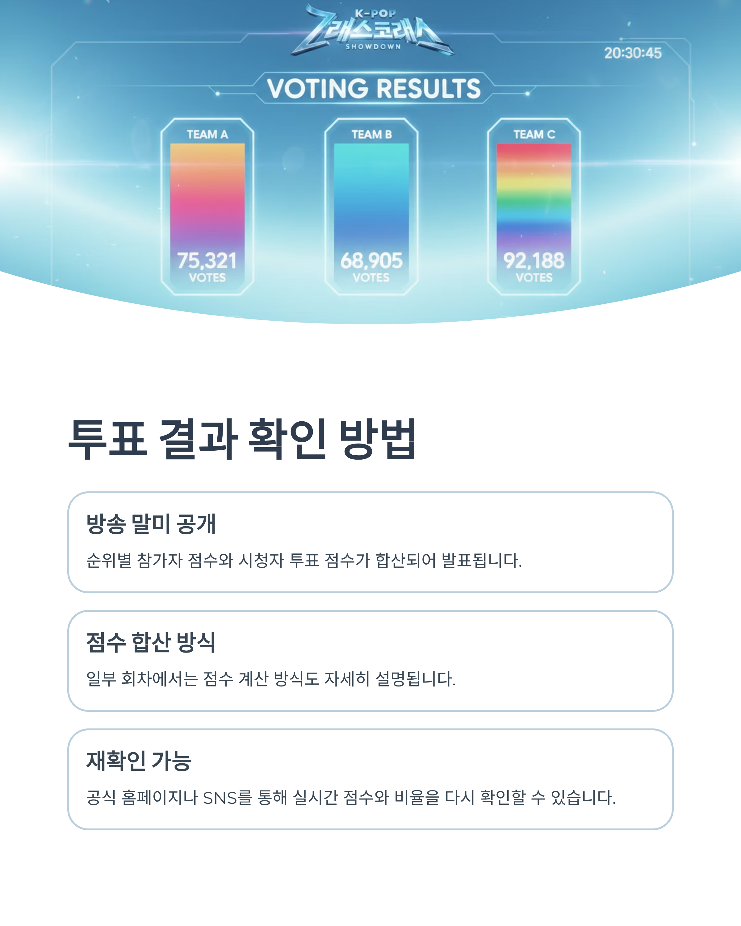 최종 투표 결과는 방송 말미에 순위별 참가자 점수와 시청자 투표 점수가 합산되어 공개됩니다. 일부 회차에서는 점수 합산 방식도 자세히 설명되며, 실시간 반영 여부도 안내됩니다.