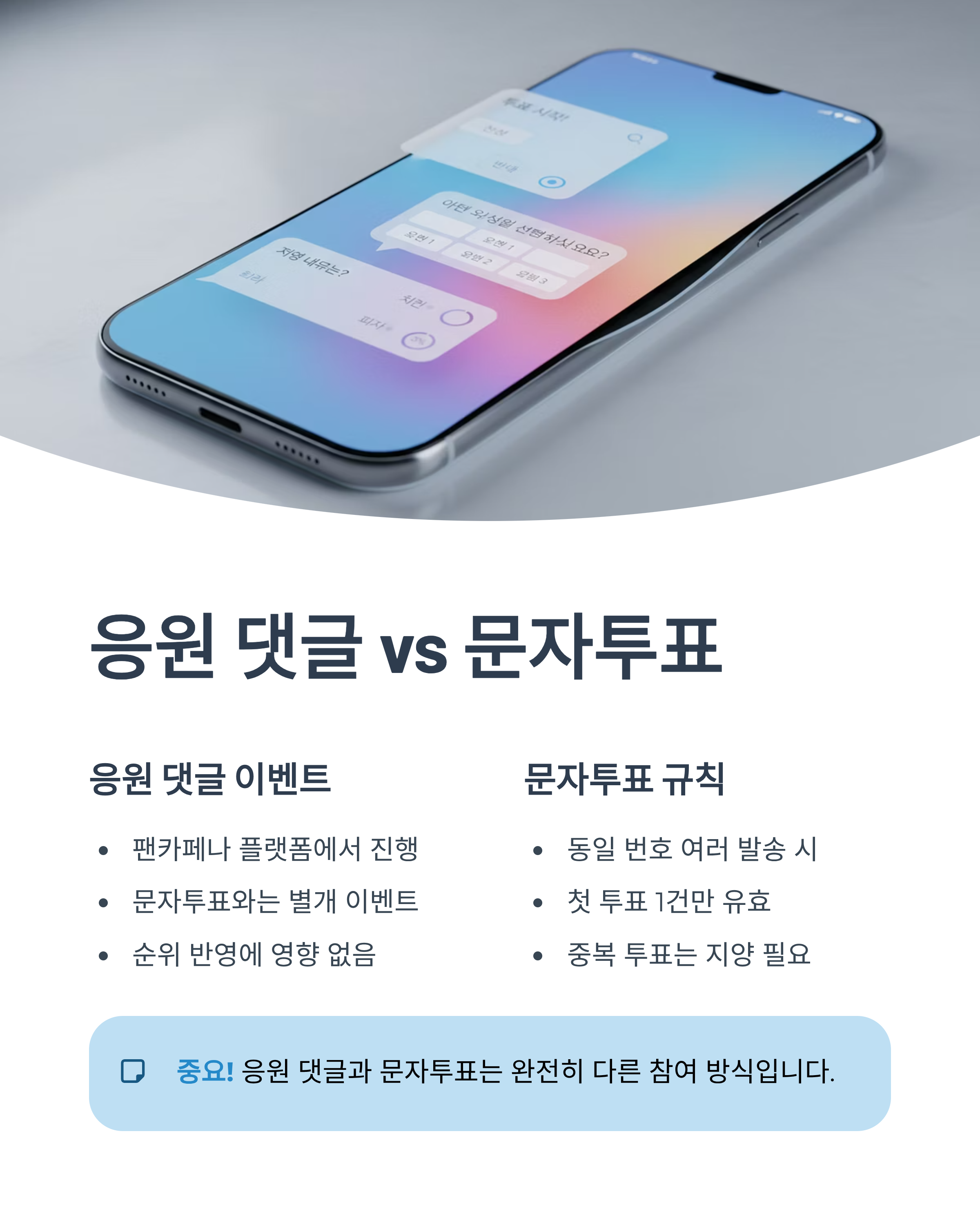 공식 팬카페나 방송 플랫폼에서 응원 댓글 이벤트가 함께 진행되는 경우도 많습니다. 그러나 이벤트 참여와 문자투표는 별개이며, 응원 댓글은 순위 반영에 영향을 주지 않는 경우가 대부분입니다.