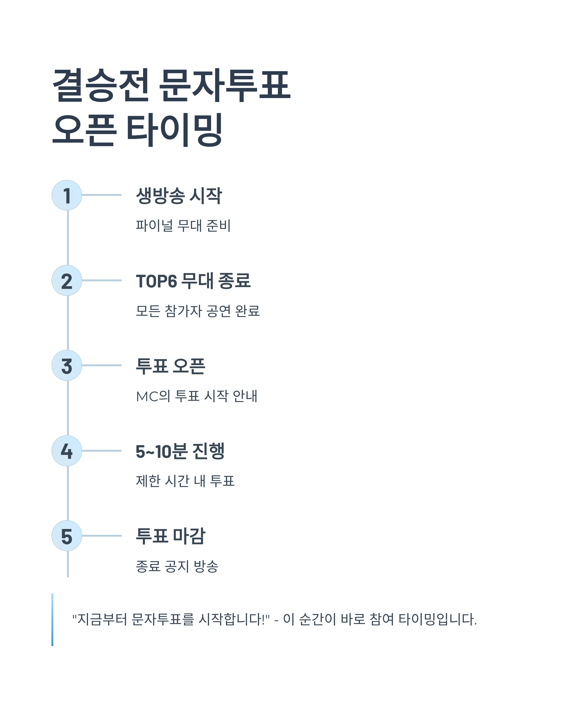 결승전은 대개 생방송이 시작된 후, TOP6 무대 종료 직후 투표 오픈이 이루어집니다. MC가 "지금부터 문자투표를 시작합니다"라고 외치는 시점이 바로 참여 타이밍입니다.