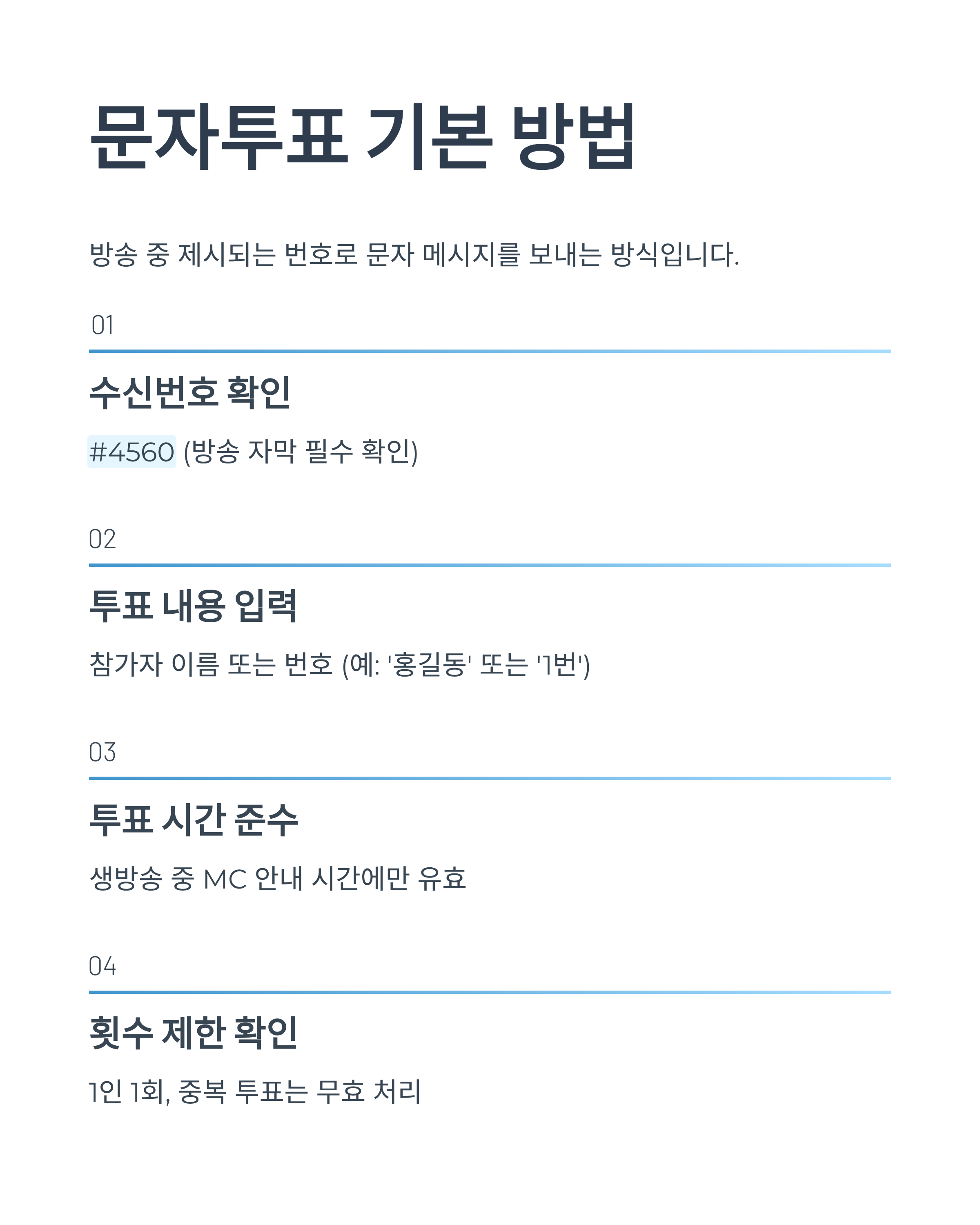 또한 동일한 번호로 여러 번 문자 발송 시, 첫 투표 1건만 유효 처리되니 중복 투표는 지양하는 것이 좋습니다.