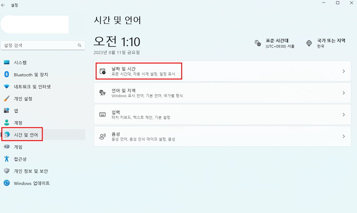 2. 좌측의 "시간 및 언어" 선택 - 우측의 "날짜 및 시간" 선택