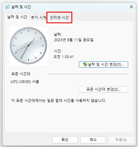 7.우측 상단 탭의 인터넷 시간을 선택한다