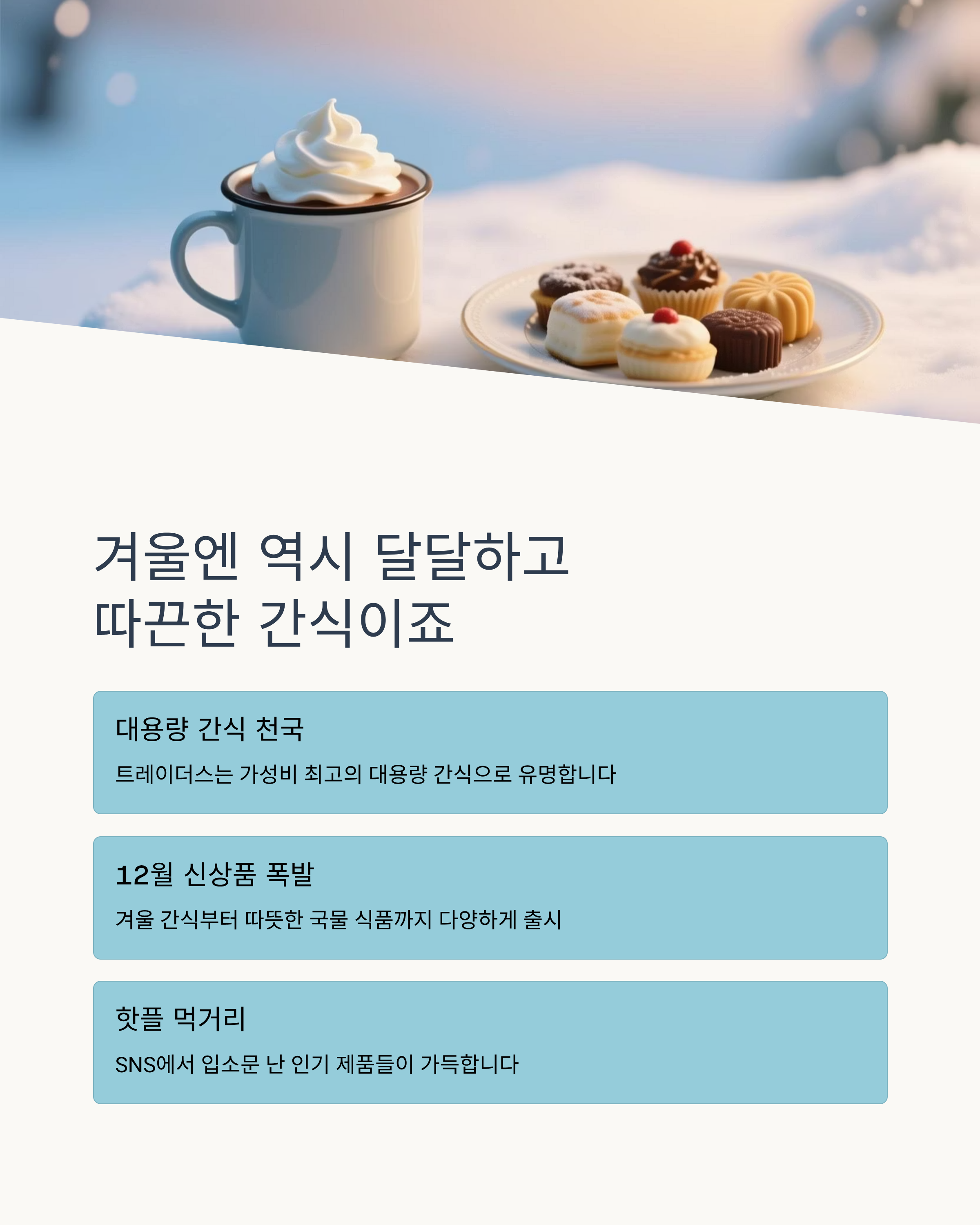 겨울이면 자꾸 당기는 달달하고 따끈한 간식들. 특히 이마트 트레이더스는 대용량 간식 천국으로 알려져 있죠. 매달 신상품이 쏟아지는 가운데, 이번 12월은 특히 겨울에 어울리는 간식, 핫플 먹거리, 따뜻한 국물용 식품까지 다양하게 출시되며 많은 소비자들의 입맛을 사로잡고 있습니다. 이 글에서는 트레이더스 추천 간식부터 요즘 가장 인기 많은 식품, 그리고 놓치면 아쉬운 신상품까지 싹 정리해드립니다.
