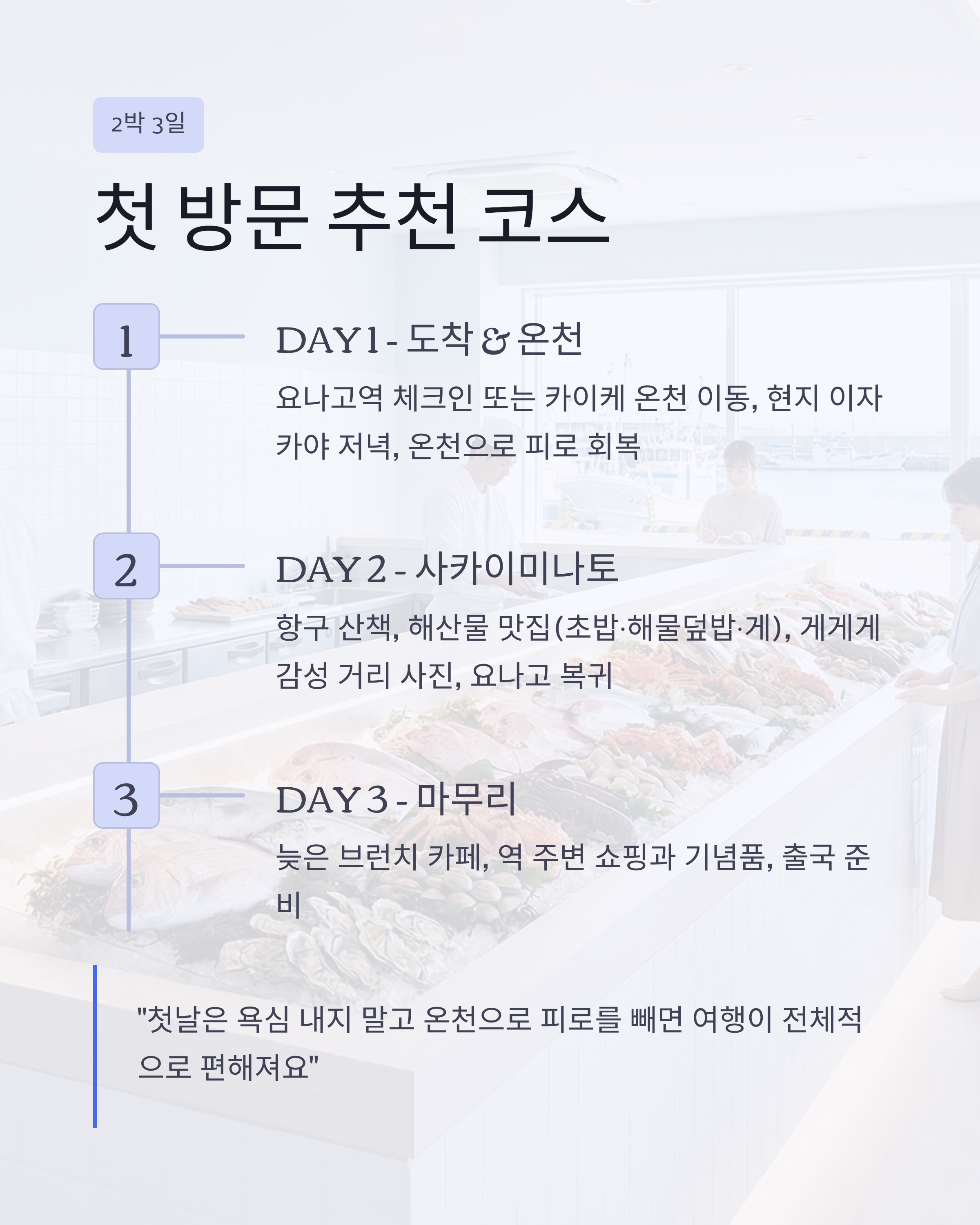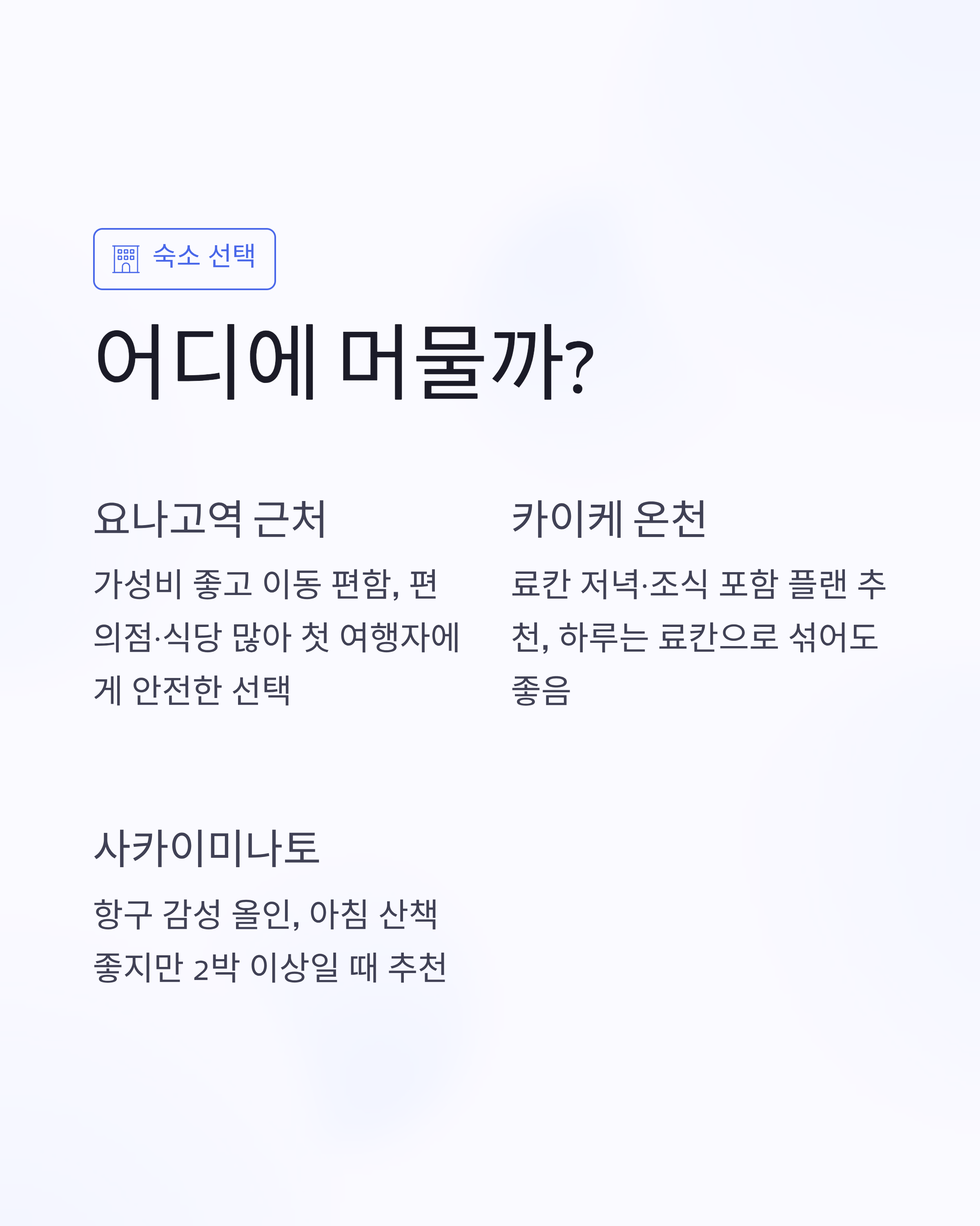포인트: 첫날은 욕심 내지 말고 온천으로 피로를 빼면 여행이 전체적으로 편해져요.