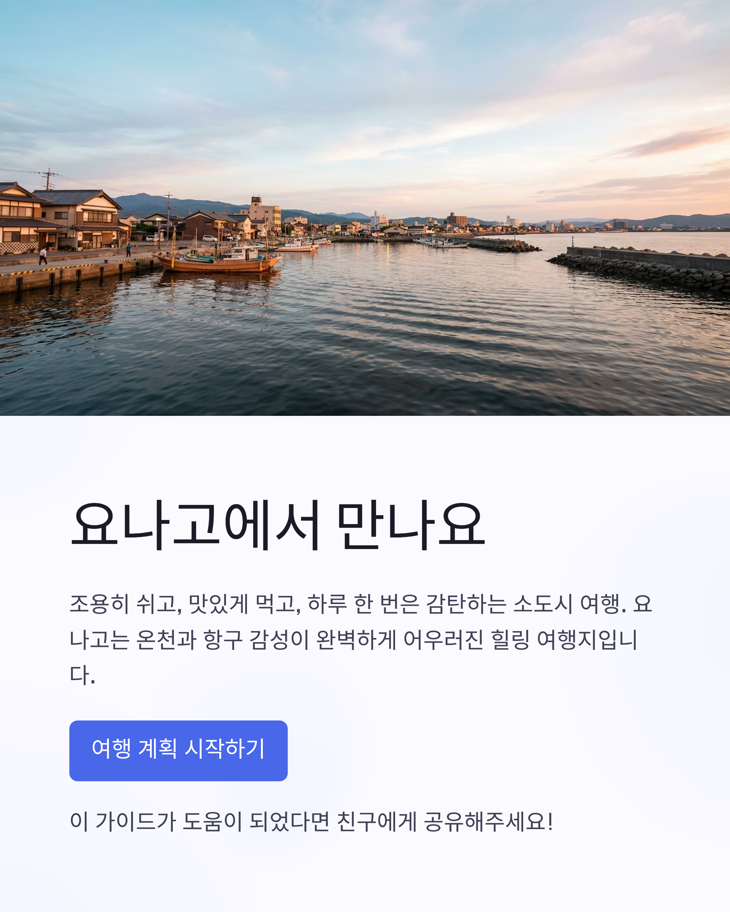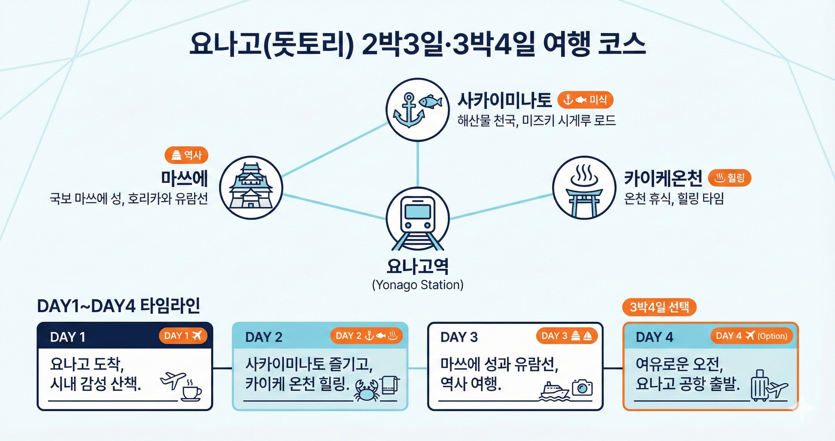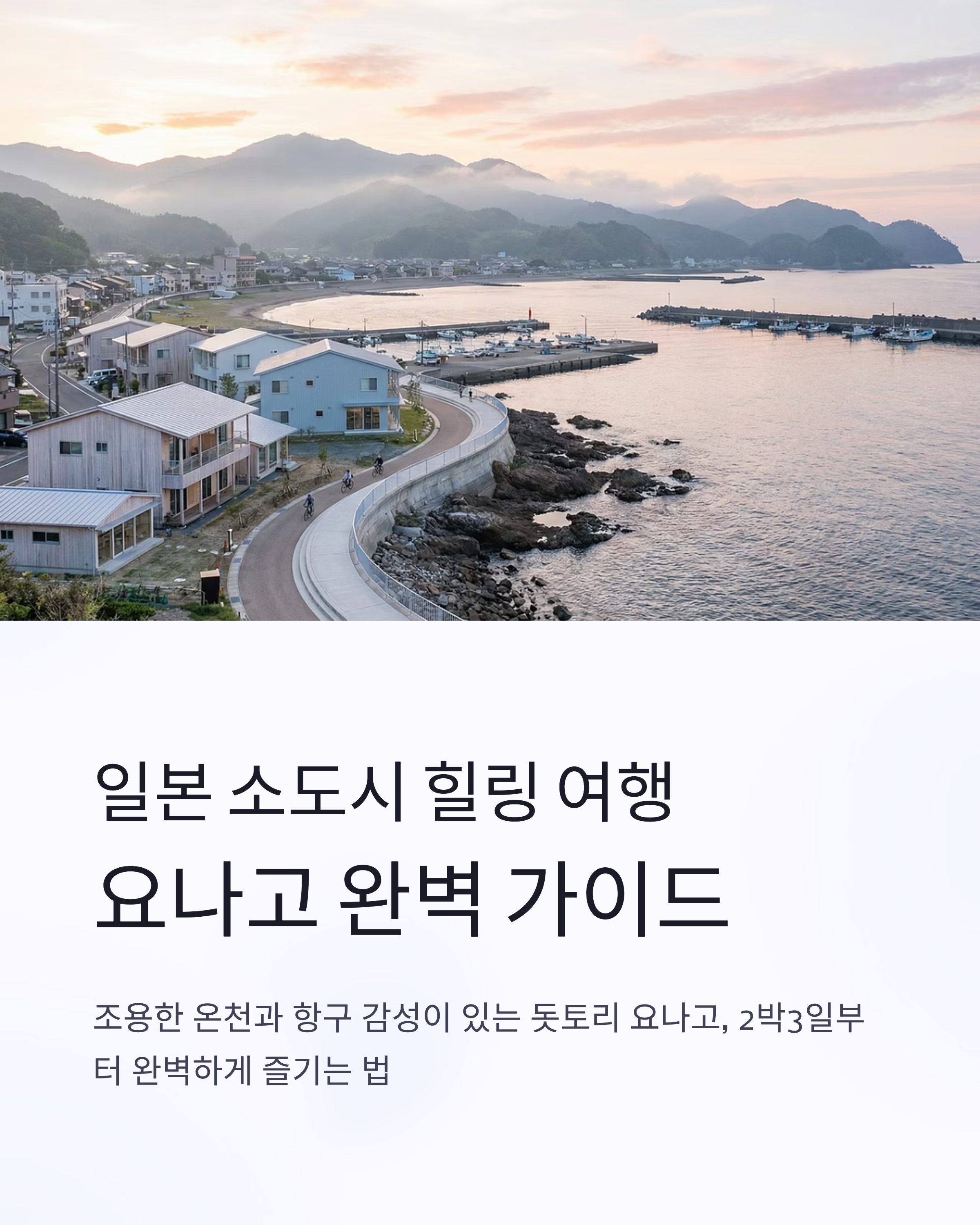 메타 설명: 일본 돗토리 요나고 여행을 처음 가는 분들을 위해 2박3일·3박4일 추천 코스, 요나고역/카이케 온천 숙소 선택법, 사카이미나토 당일치기 동선, 계절별 팁과 예상 비용·준비물까지 한 번에 정리한 소도시 힐링 가이드입니다.