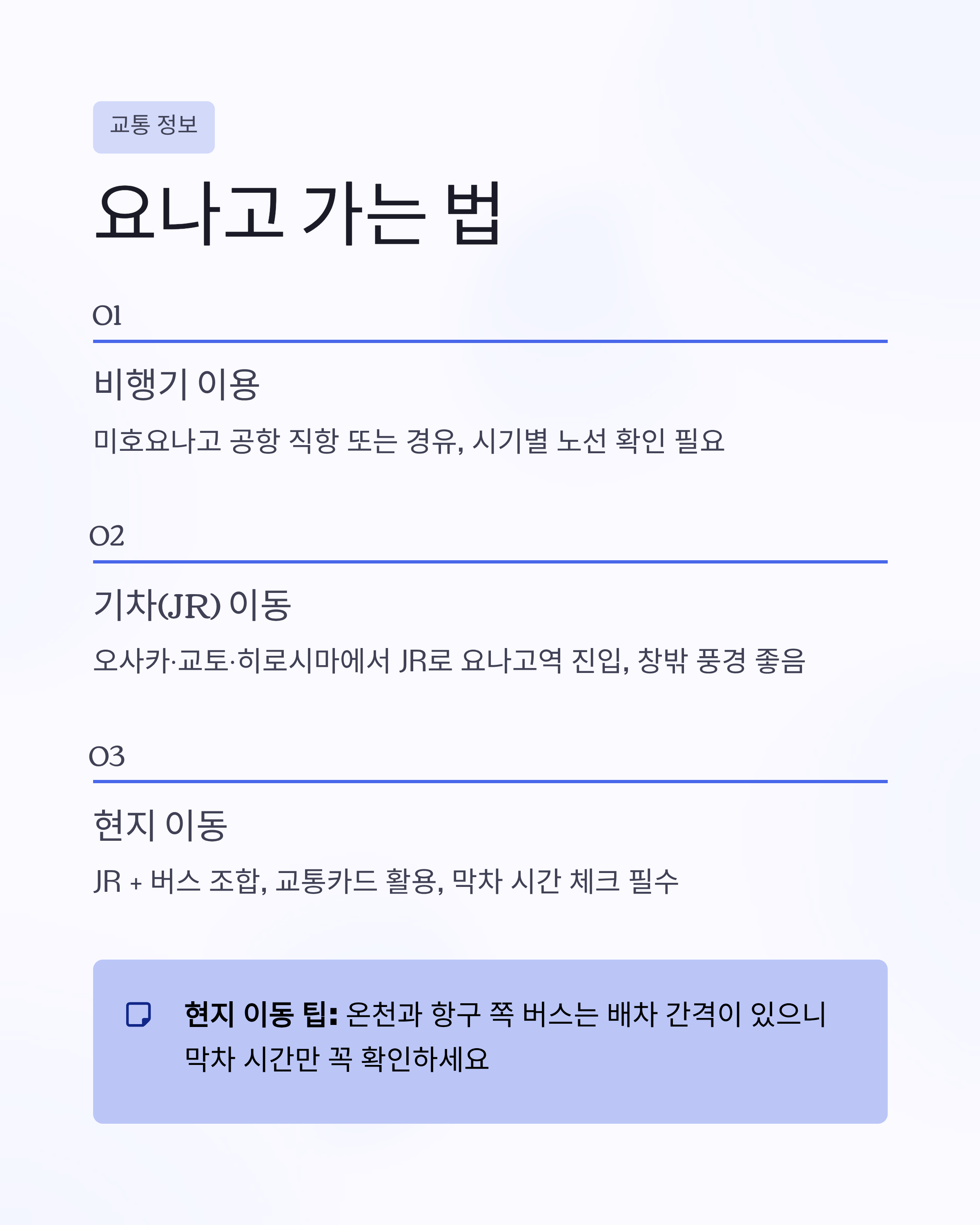 요나고 공항(미호요나고 공항)을 이용하면 가장 편하지만, 노선/운항일은 시기마다 달라질 수 있어요.