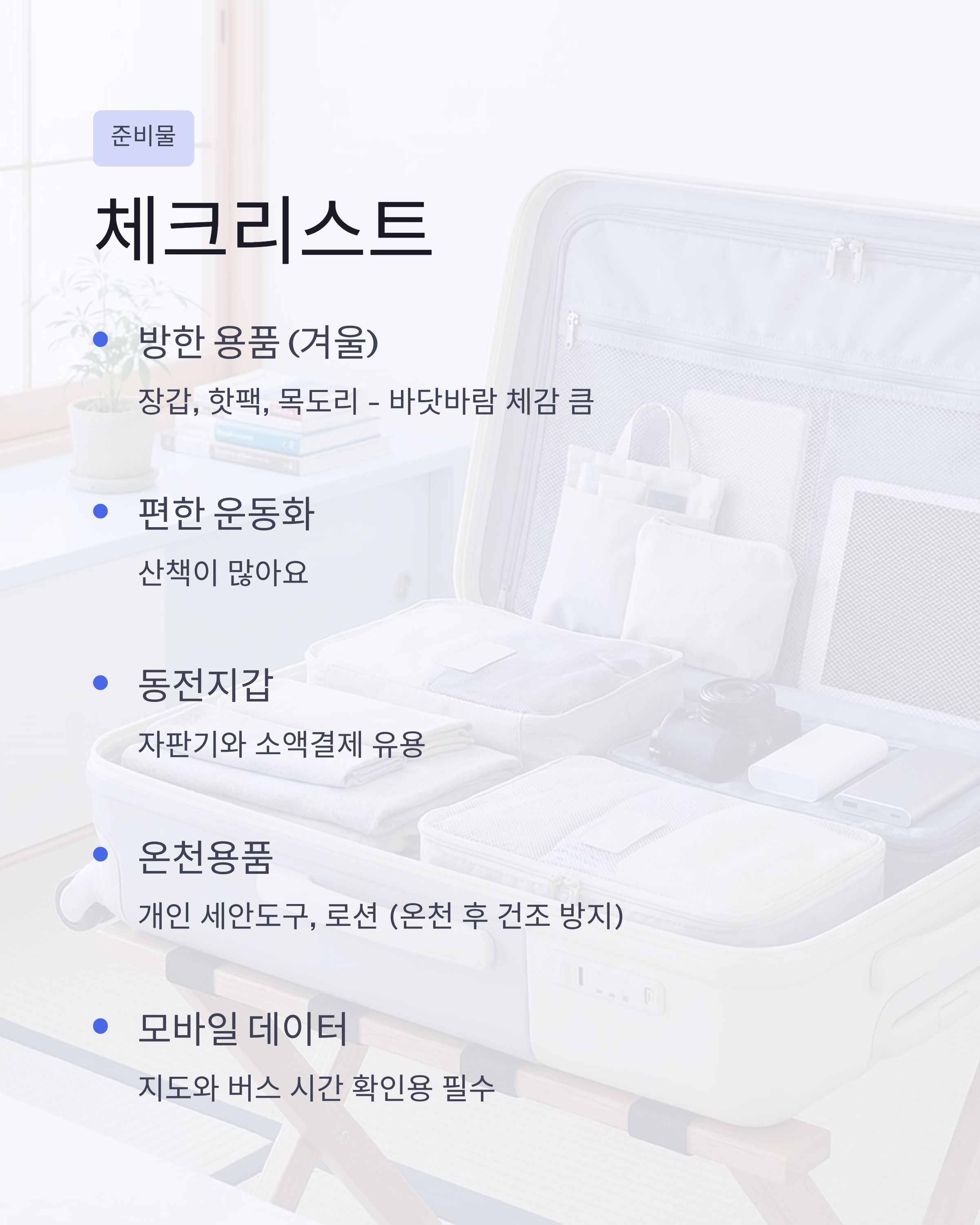 - 온천/항구 쪽은 버스 시간이 텀이 있을 수 있으니, 막차 시간만 꼭 체크해두면 마음이 편합니다.