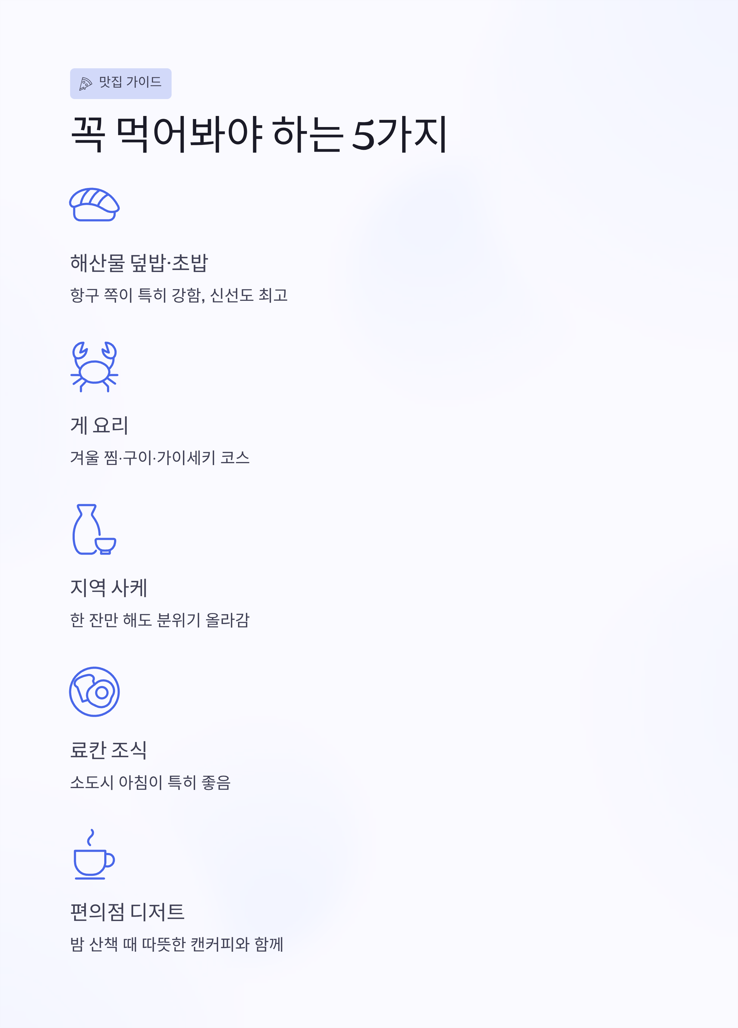 - 낮: 항구 주변 산책 + 해산물(초밥/해물덮밥/게 요리 시즌이면 게)