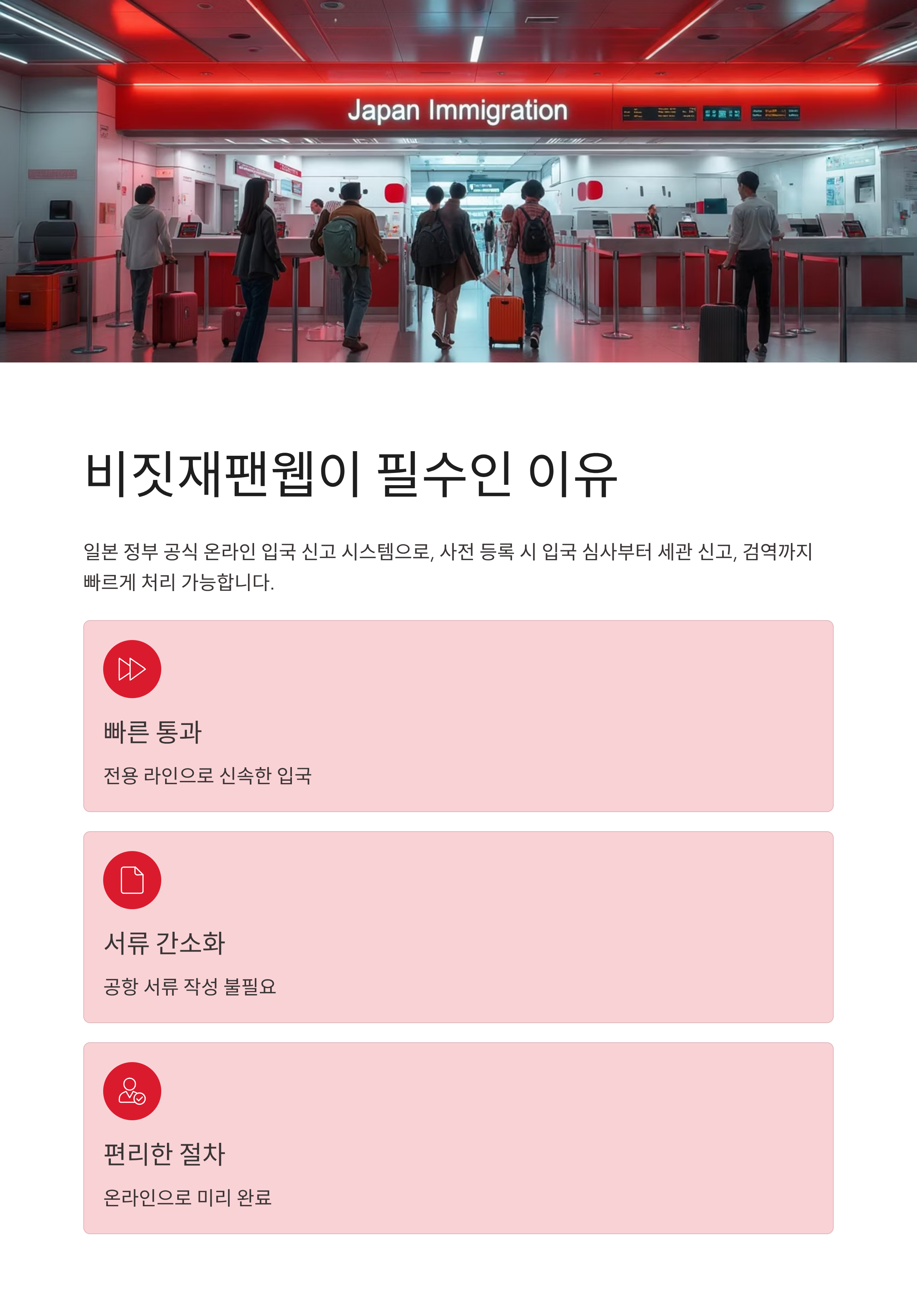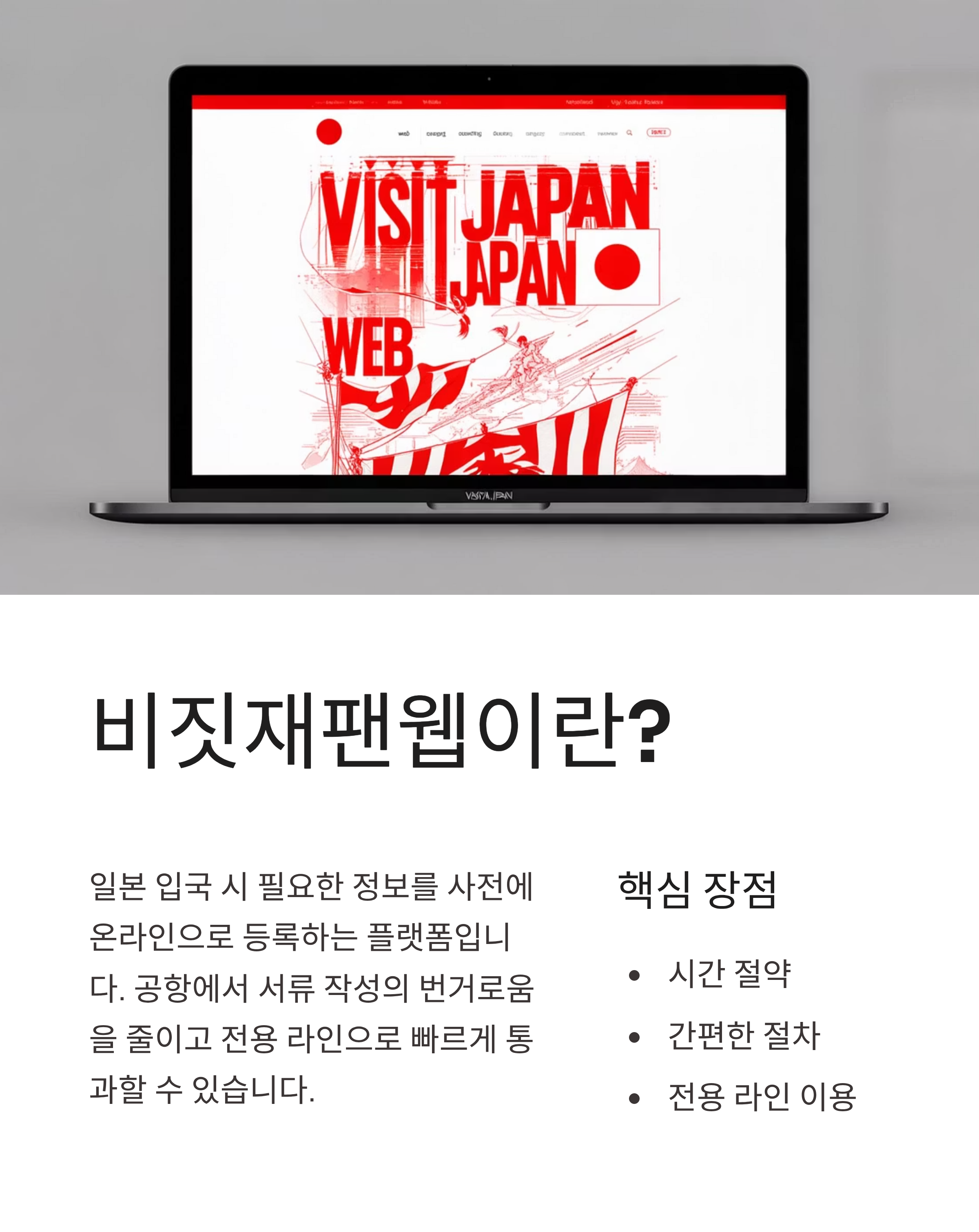 비짓재팬웹은 일본 입국 시 필요한 정보를 사전에 온라인으로 등록할 수 있는 플랫폼입니다. 공항에서 서류를 일일이 작성하는 번거로움을 줄여주고, 전용 라인을 이용해 빠르게 통과할 수 있다는 장점이 있어요.