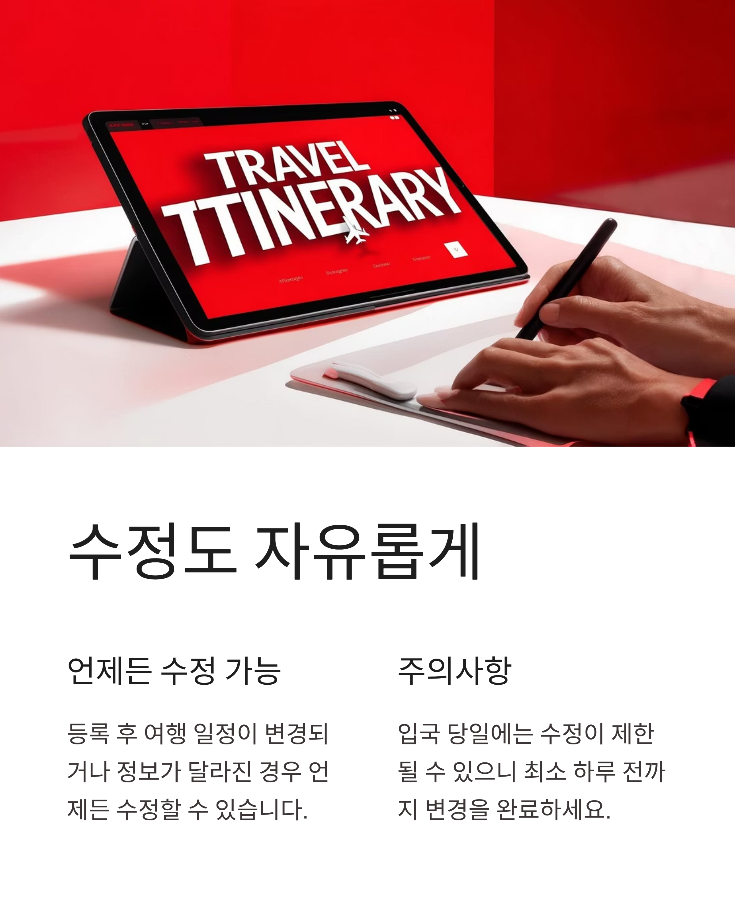 네, 등록 후 여행 일정이 변경되거나 정보가 달라진 경우 언제든 수정 가능합니다. 다만, 입국 당일에는 수정이 제한될 수 있으니 최소 하루 전까지는 변경을 완료해주세요.