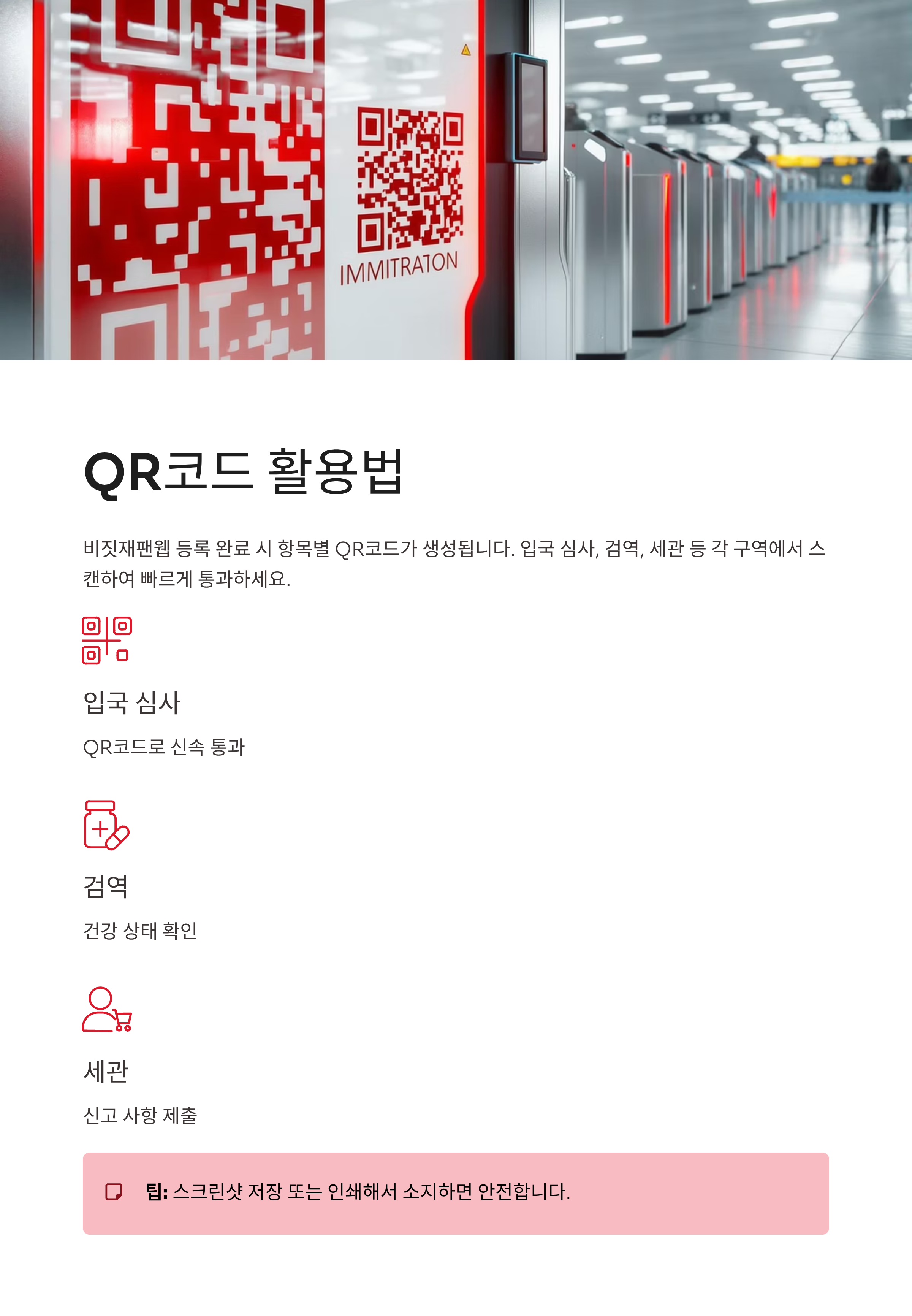 비짓재팬웹 등록이 완료되면 항목별 QR코드가 생성됩니다. 입국 심사, 검역, 세관 등 각 구역에서 해당 코드를 스캔해 빠르게 통과할 수 있어요. 스크린샷 저장 또는 인쇄해서 소지하는 것이 안전합니다.