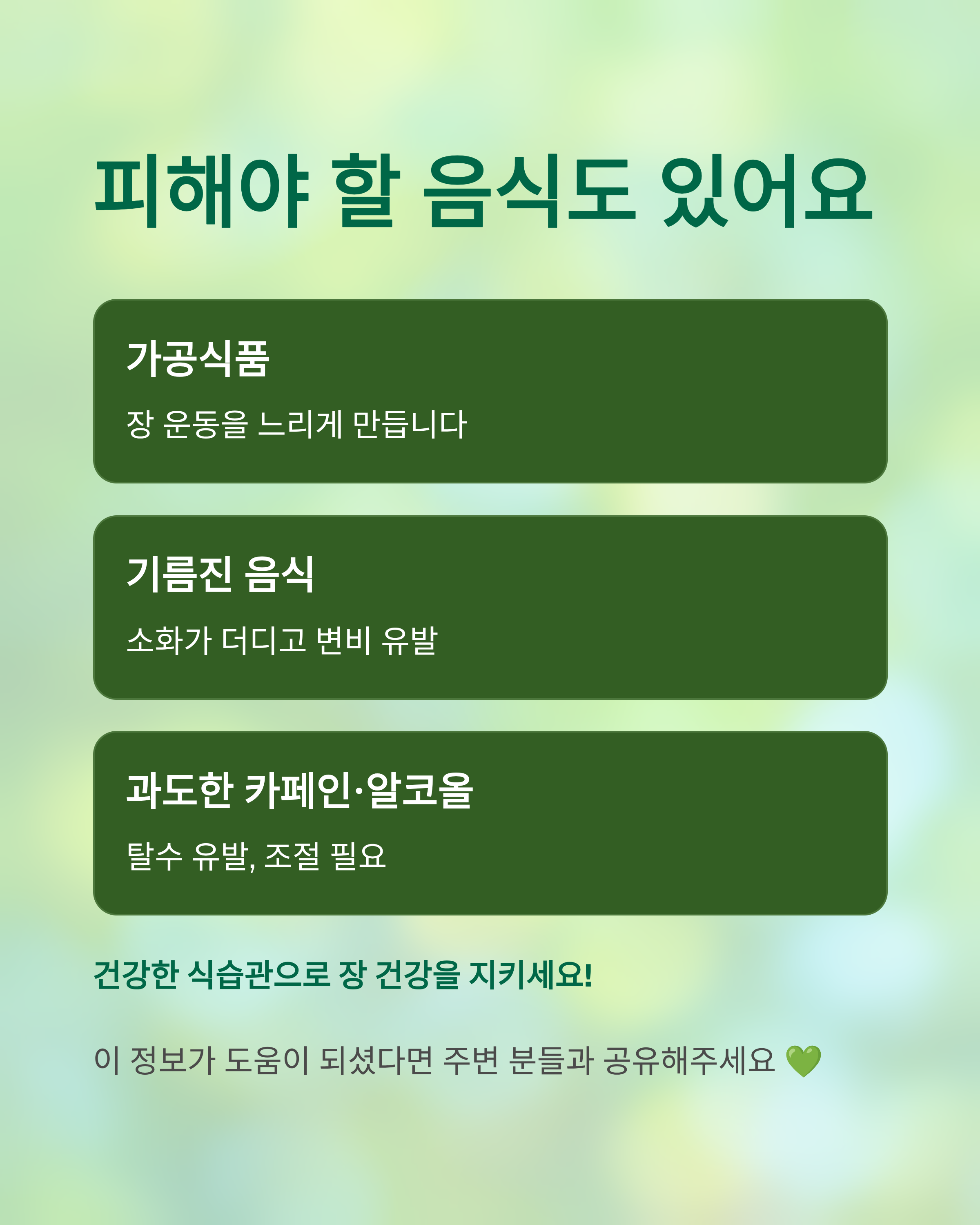 가공식품, 기름진 음식, 인스턴트 식품 등은 오히려 장을 느리게 만들 수 있습니다. 또한 지나친 카페인, 알코올도 변비를 유발할 수 있으니 조절이 필요해요.