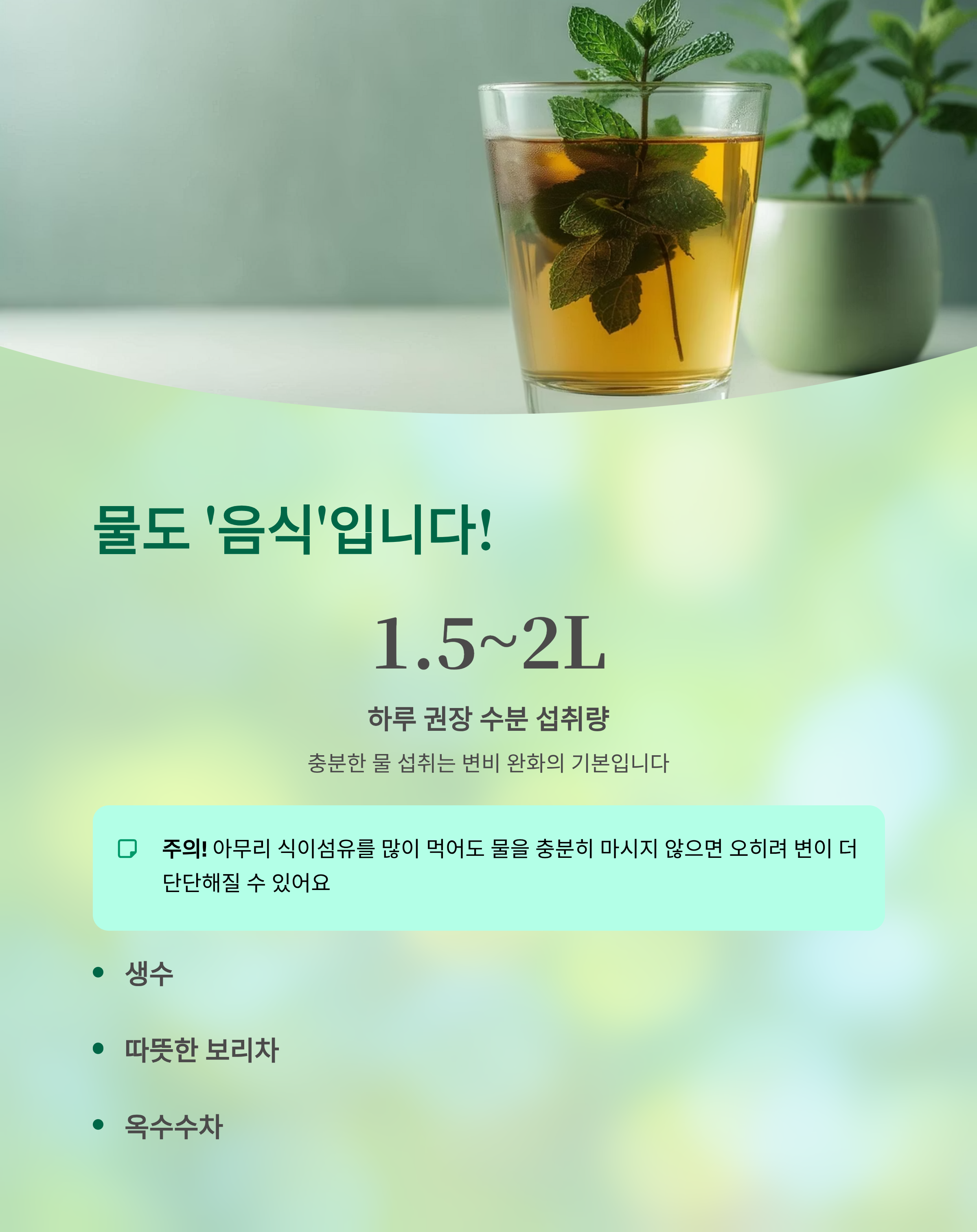 아무리 식이섬유를 많이 먹어도 물을 충분히 마시지 않으면 오히려 변이 더 단단해질 수 있어요. 하루에 1.5~2리터 정도의 수분 섭취는 기본! 생수 외에도 따뜻한 보리차, 옥수수차도 추천됩니다.