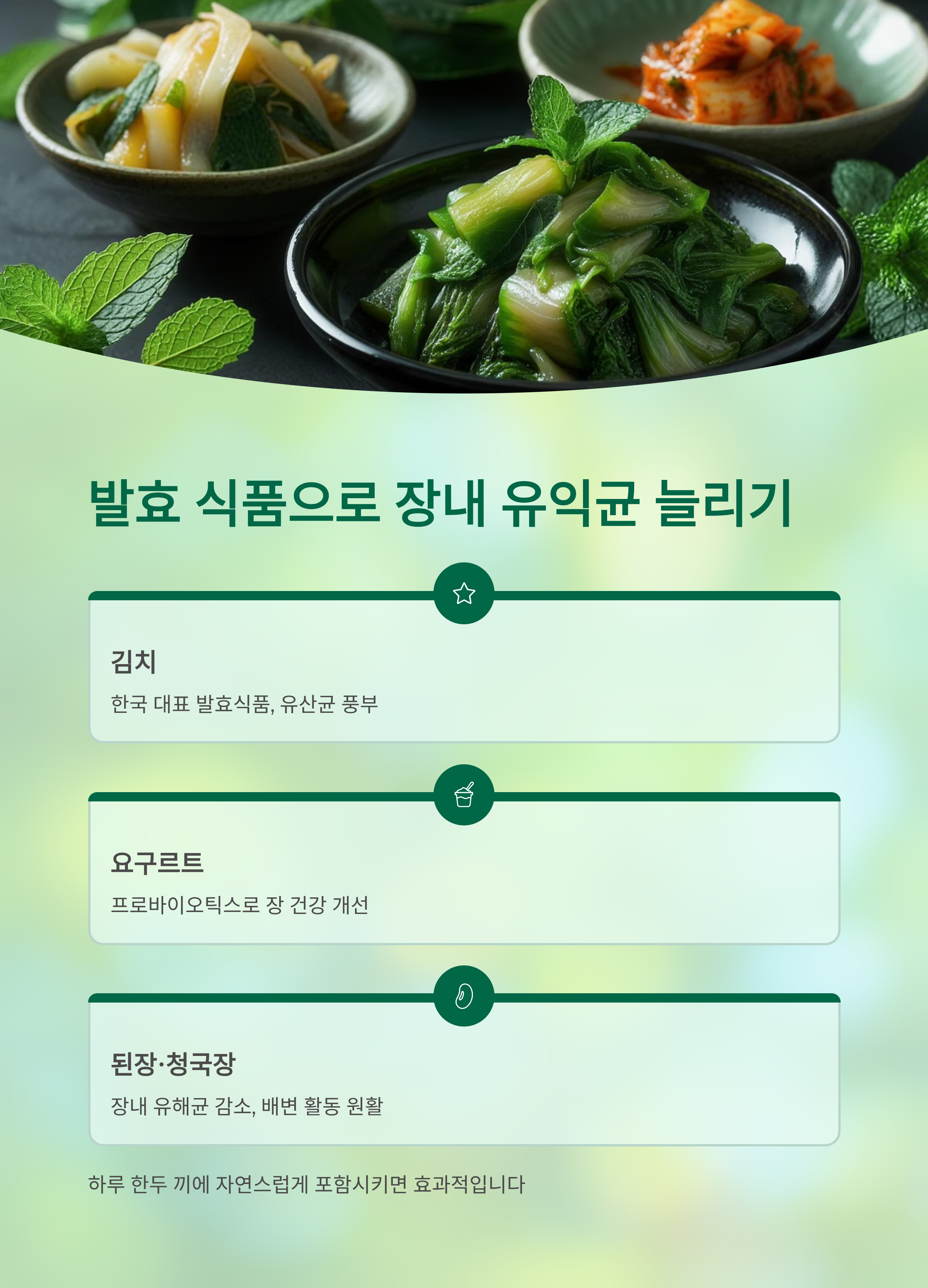 김치, 요구르트, 된장, 청국장 같은 발효식품에는 유산균이 풍부하게 들어 있어요. 이 유산균은 장내 유해균을 줄이고 배변 활동을 원활하게 도와줍니다. 하루에 한두 끼에 자연스럽게 포함시키면 효과적이에요.