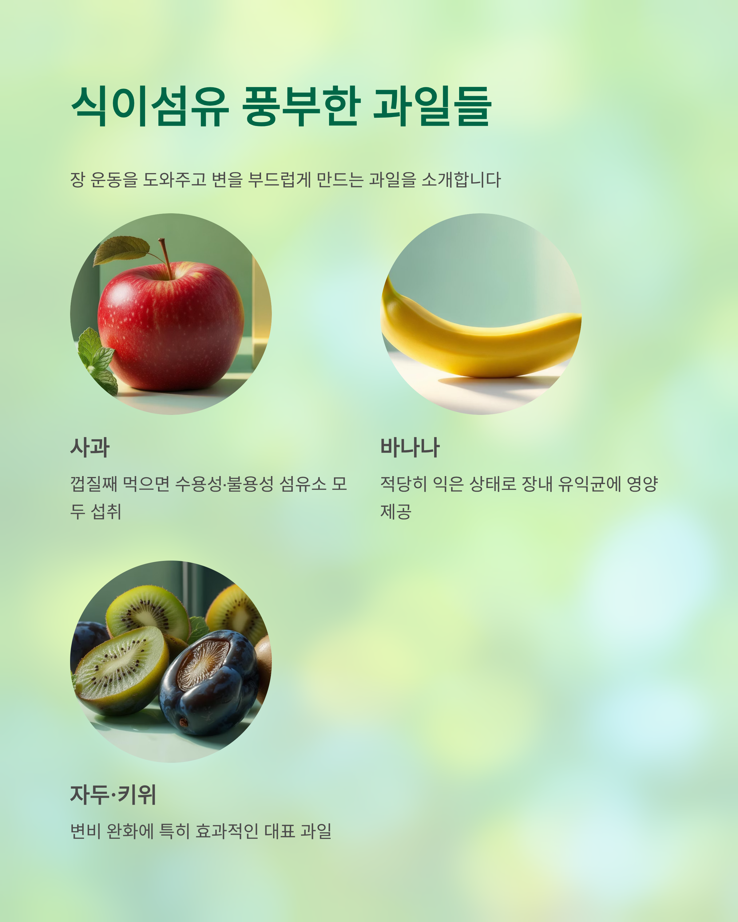 사과는 껍질째 먹으면 수용성과 불용성 섬유소를 모두 섭취할 수 있어요. 바나나는 적당히 익은 상태에서 먹으면 장내 유익균에 좋은 영양소를 제공합니다. 자두나 키위도 변비 완화에 많이 추천되는 과일입니다.